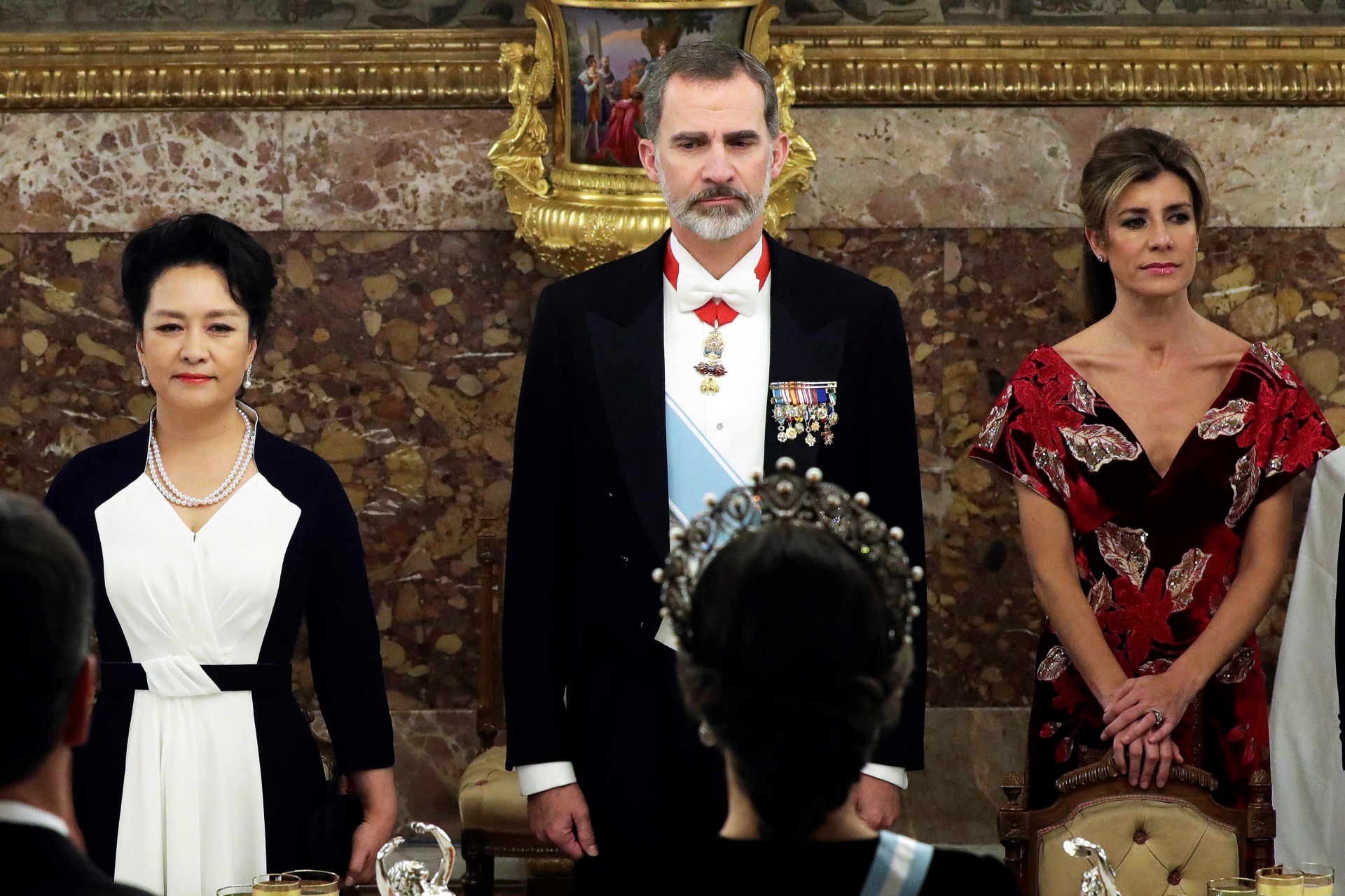 Lo mismo ocurre con Felipe VI, que se sentó en la cena de gala junto a Begoña Gómez y a su derecha Peng Liyuan.