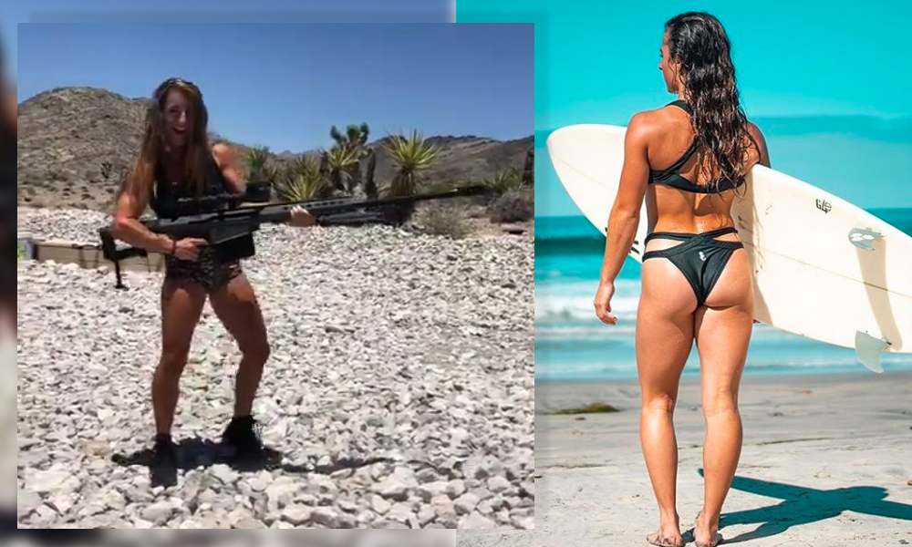 Esta atleta estadounidense ha demostrado ser también fanática de las armas. No es raro verla posar (y disparar) cañones como el de la imagen.