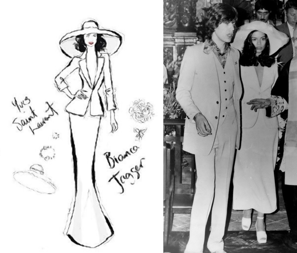 Los vestidos de novia de Grace Kelly, la princesa Diana de Gales o Jackie Kennedy pasarán a la historia, pero el de Bianca Jagger ocupa un lugar especial en la moda nupcial. Se casó con Mick Jagger embarazada de cuatro meses en 1971 y reinventó el clásico vestido blanco para enfundarse un esmoquin con falda de Yves Saint Laurent. Como anécdota, Hess recuerda que Bianca no llevaba ropa interior.