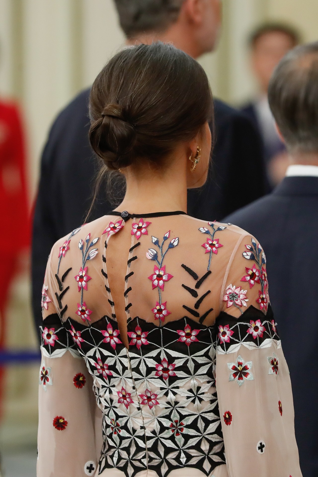 Un detalle de la espalda y los adornos florales del vestido. Letizia optó por llevar el pelo recogido en un moño.