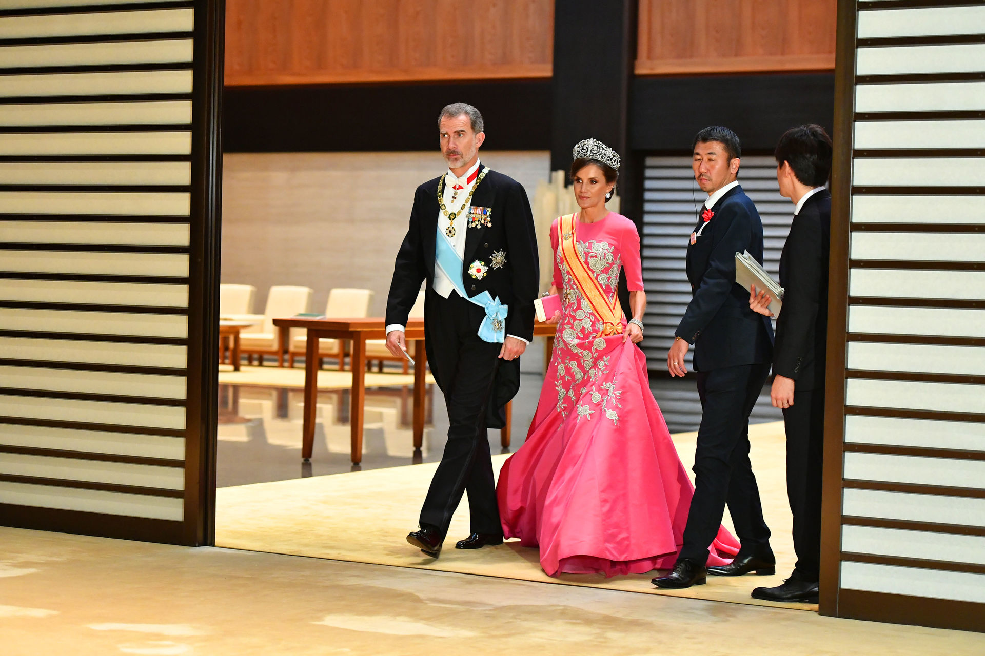 La reina Letizia continuó deslumbrando en su viaje oficial a Japón junto a Felipe VI y estrenó en la cena otro vestidazo hecho a medida, esta vez firmado por Carolina Herrera. Se trata de un diseño rosa que recuerda a los capotes taurinos con flores blancas bordadas en la cintura.