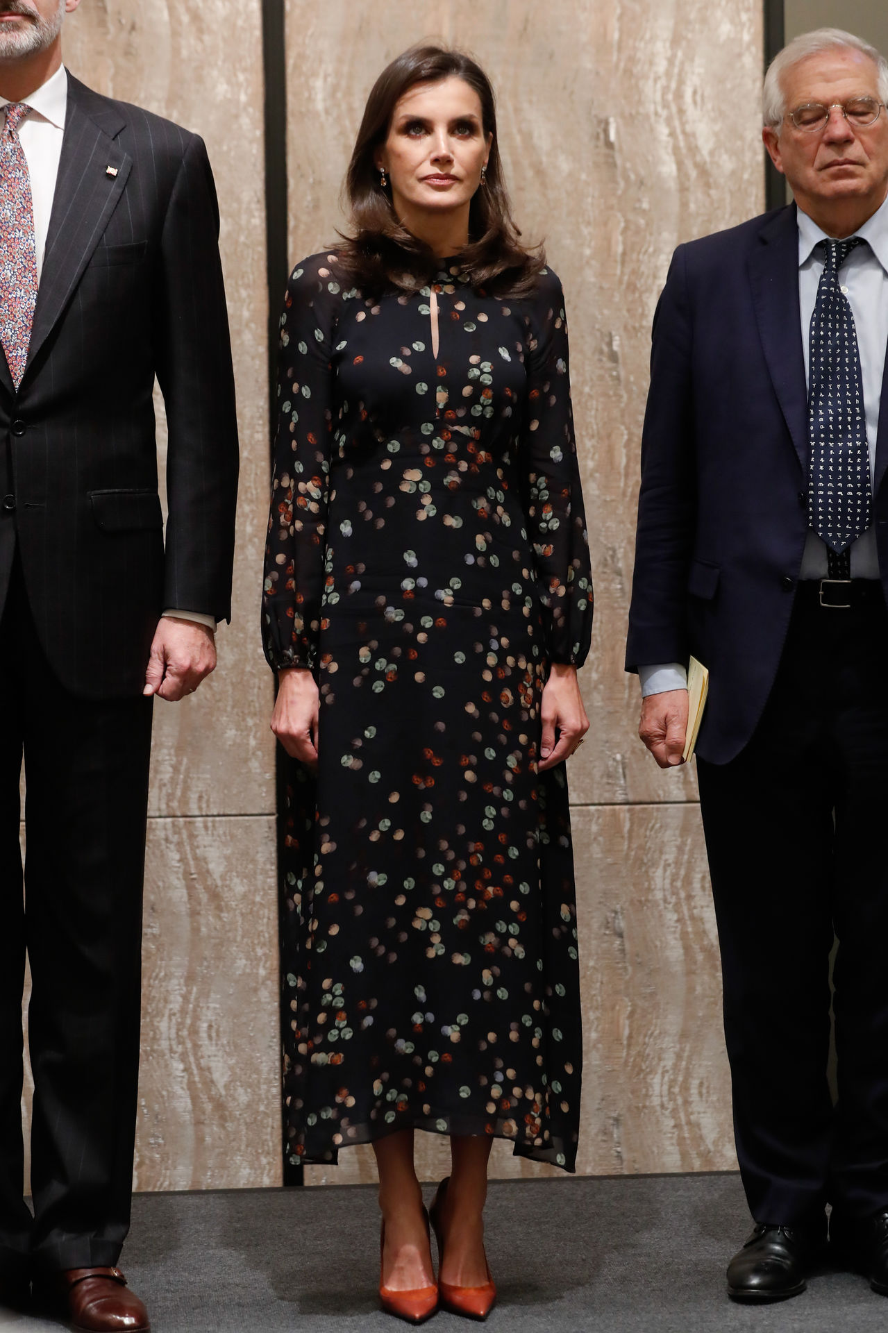 El vestido con estampado floral con tonos azules, morados y verdes tiene un escote redondo y manga francesa. Un vestido que ya lució durante su visita a Londres en Marzo. En sus pies, unos salones de ante de la firma Nina Ricci.