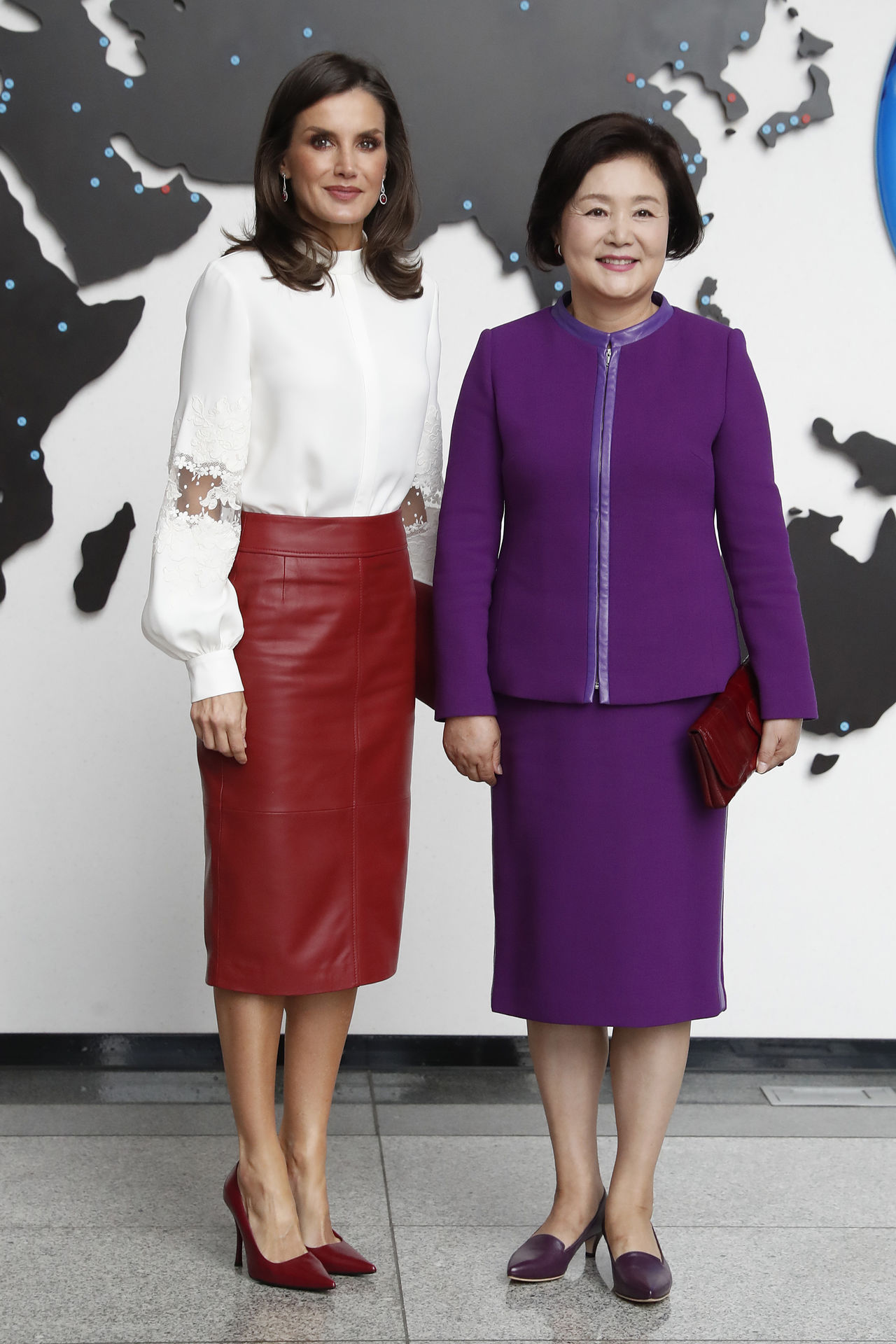 Para su visita al ayuntamiento de Seúl, Letizia estrenó una falda roja de cuero de la firma Hugo Boss cuyo precio ronda los cuatrocientos euros. Está hecha en piel de cordero y recuerda a la falda que lució en 2017 de la misma marca.