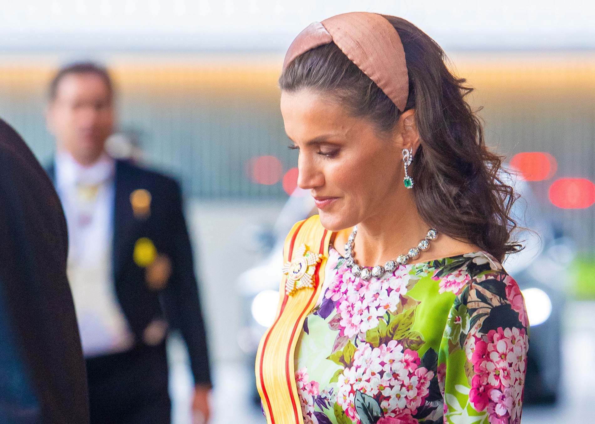 Si el vestido estampado con flores ya era arriesgado, las joyas y la diadema le dieron el toque exagerado y acertado. No es habitual ver a la Reina con el pelo recogido hacia atrás, pero en su visita a Japón, escogió una diadema artesanal de rafia y terciopelo rosa empolvado de la firma sevillana Nana Golmar a juego con el bolso de mano.