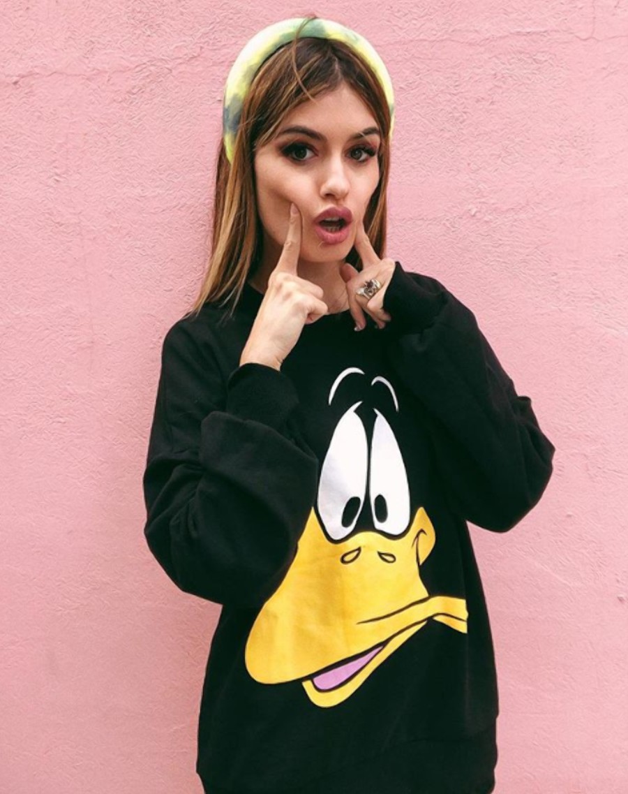 A Ángela Rozas, conocida como Madame de Rosa, no le hace falta ningún evento elegante para llevar una diadema llamativa como esta en colores degradados de Asos, que combina con una sencilla sudadera del Pato Lucas.