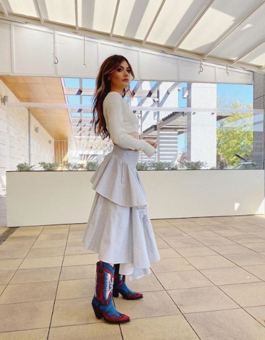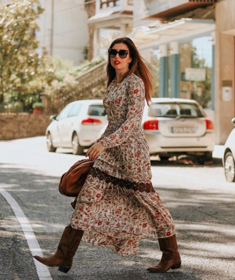 La influencer (y mujer de Santiago Abascal) se ha colado entre las más elegantes de Instagram. Su estilo incluye muy a menudo prendas básicas combinadas con acierto, pero también sabe arriesgar con las tendencias. En este caso luce unas botas cowboy altas de color marrón con un vestido largo de flores que soluciona con estilo cualquier día de la semana.