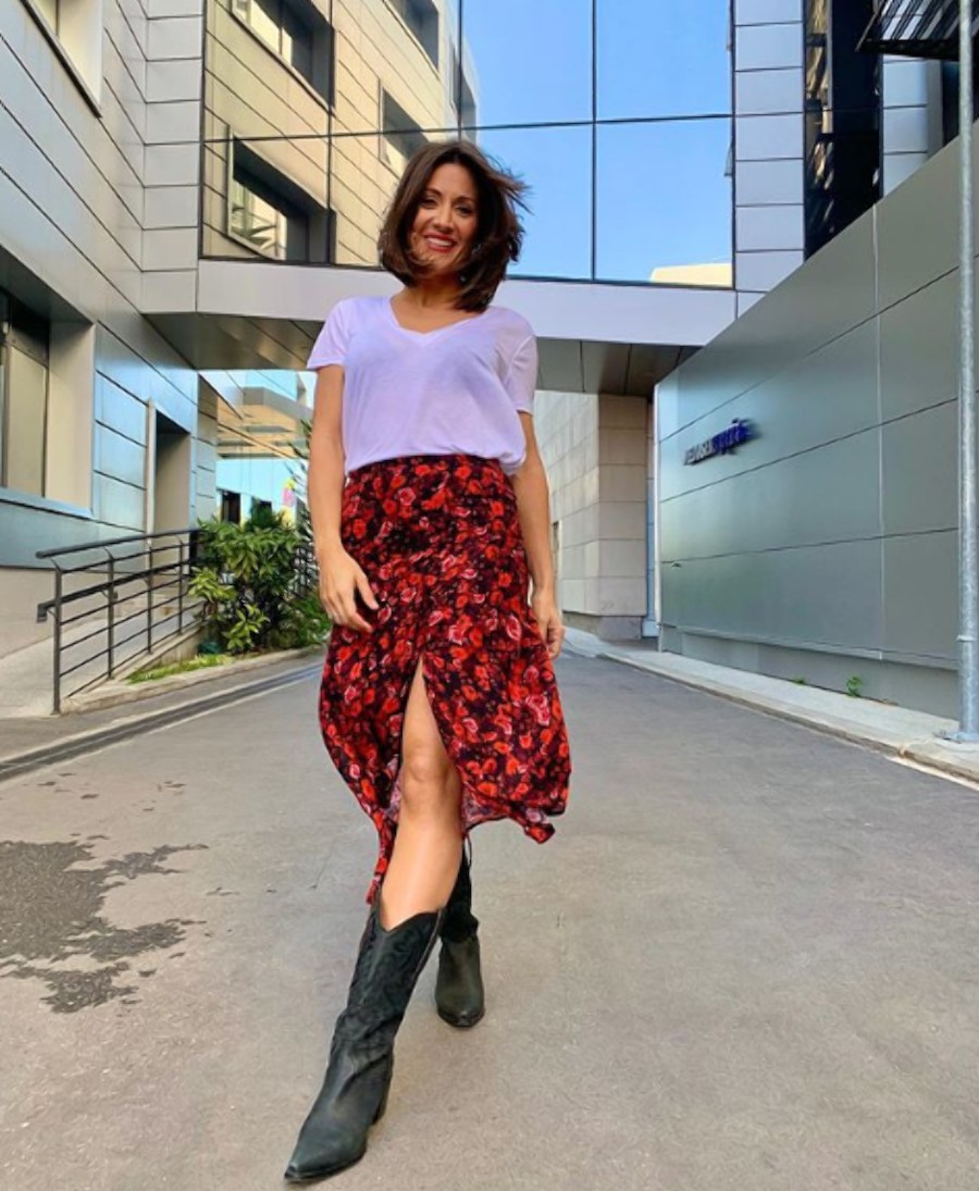 La falda estampada acapara todo el protagonismo en el estilismo de la presentadora de televisión, pero unas botas negras altas lo completan.