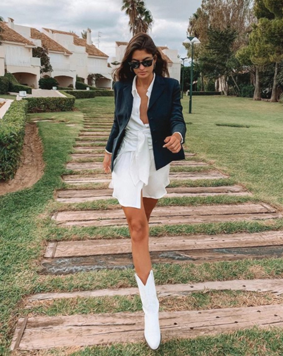 La actriz no es capaz de dejar pasar una sola tendencia y en su armario no pueden faltar unas botas de cowboy. En este caso son blancas, que destacan por encima del sencillo vestido negro.