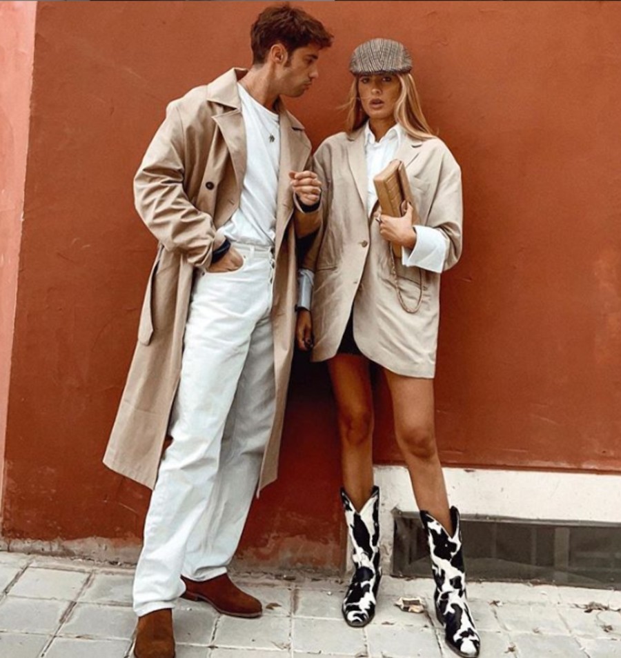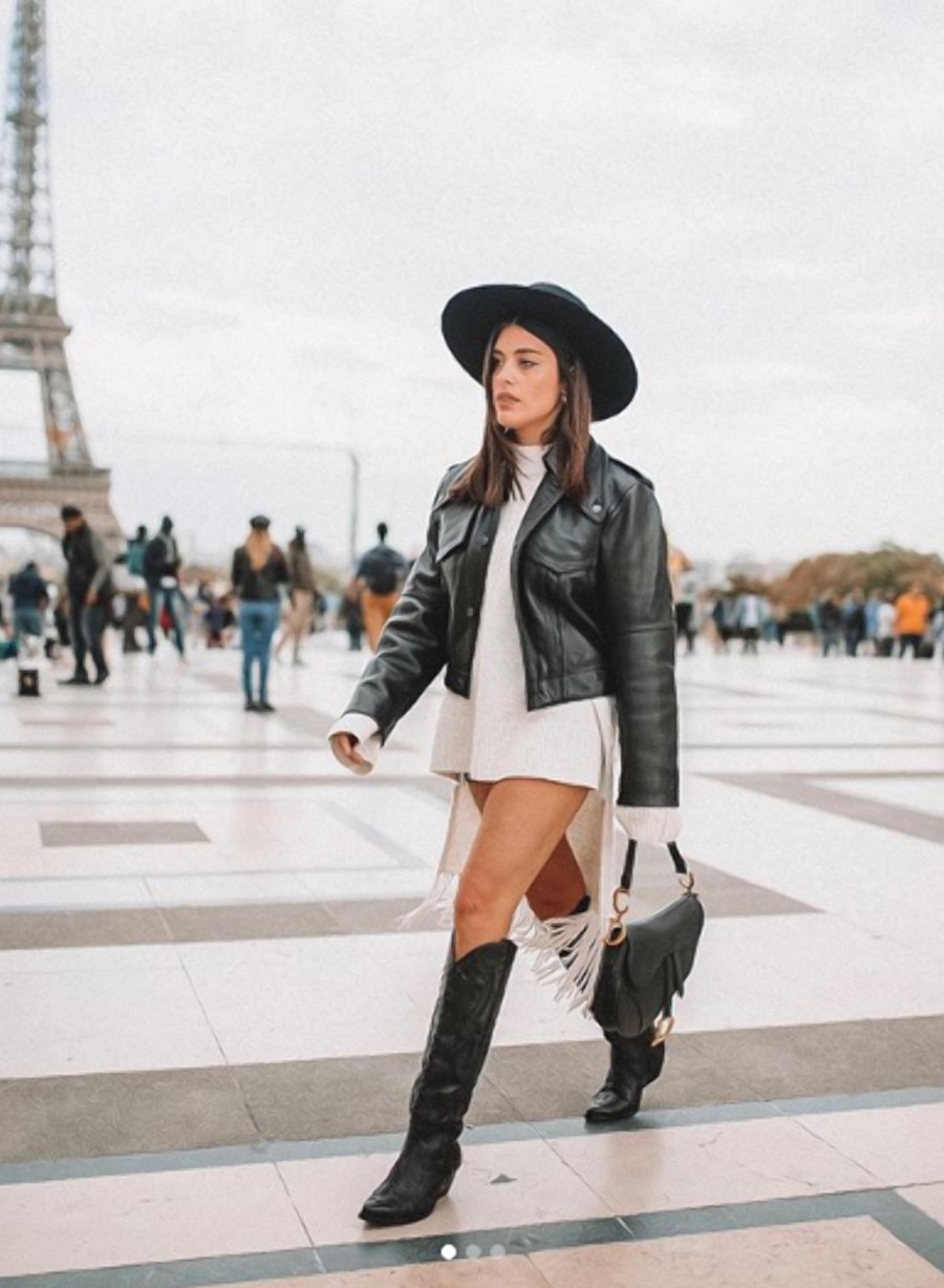 El estilismo imposible de la influencer lo completan estas botas tejanas altas con estampado de vaca en piel de potro y suela de cuero.
