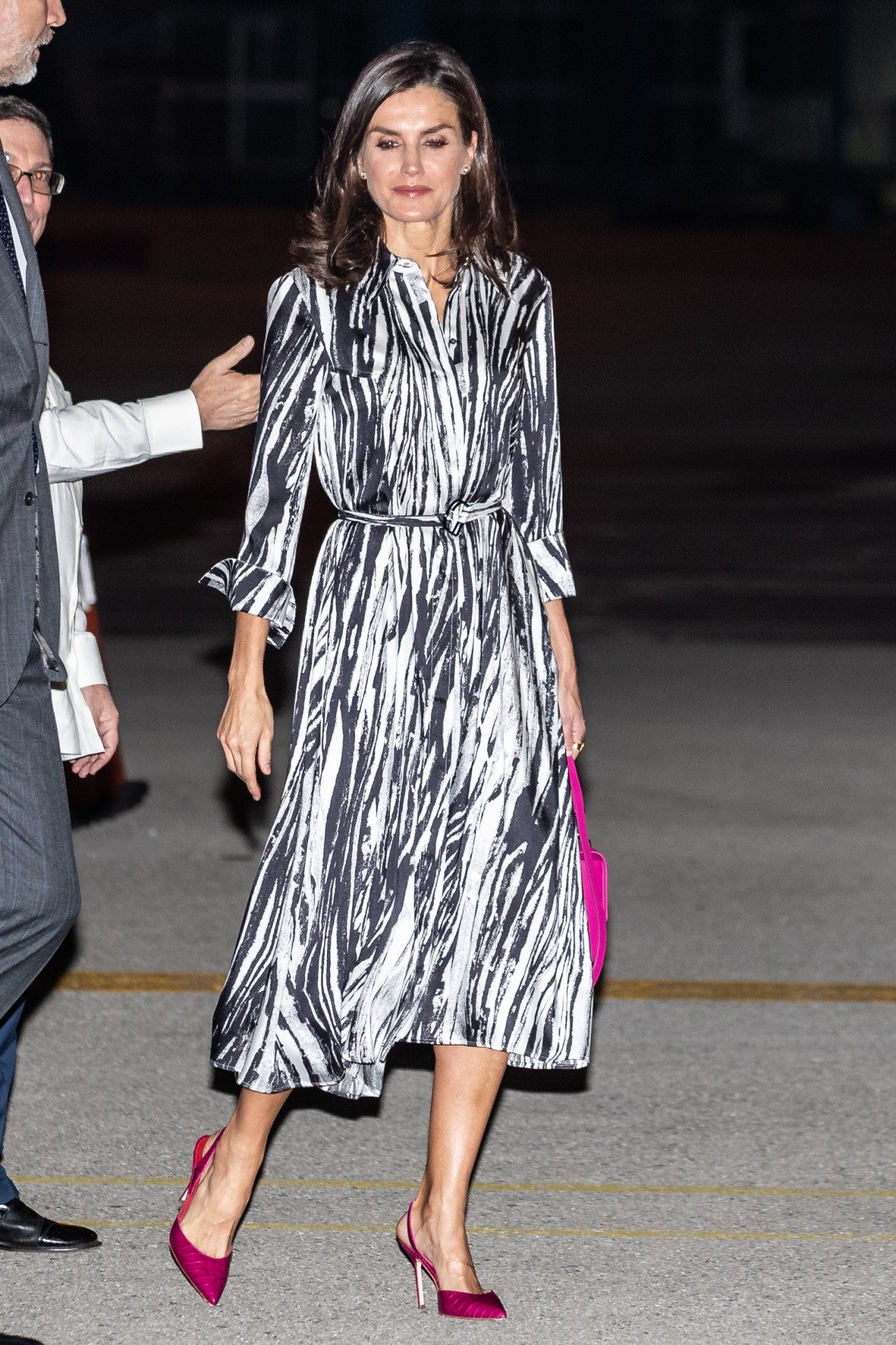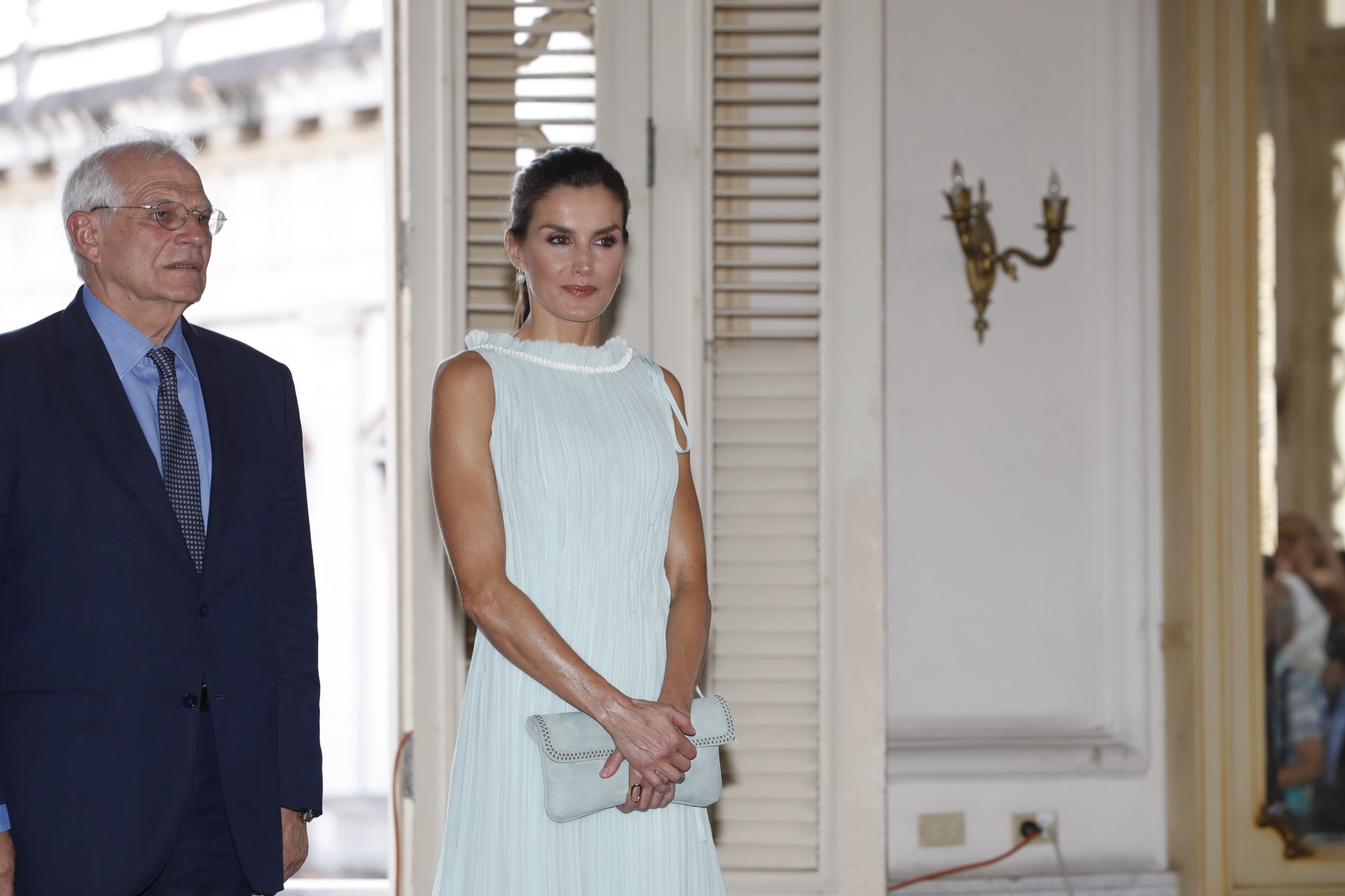 Letizia Ortiz llega a La Habana. Para su primer estilismo cubano eligió un vestido vaporoso de Hugo Boss.