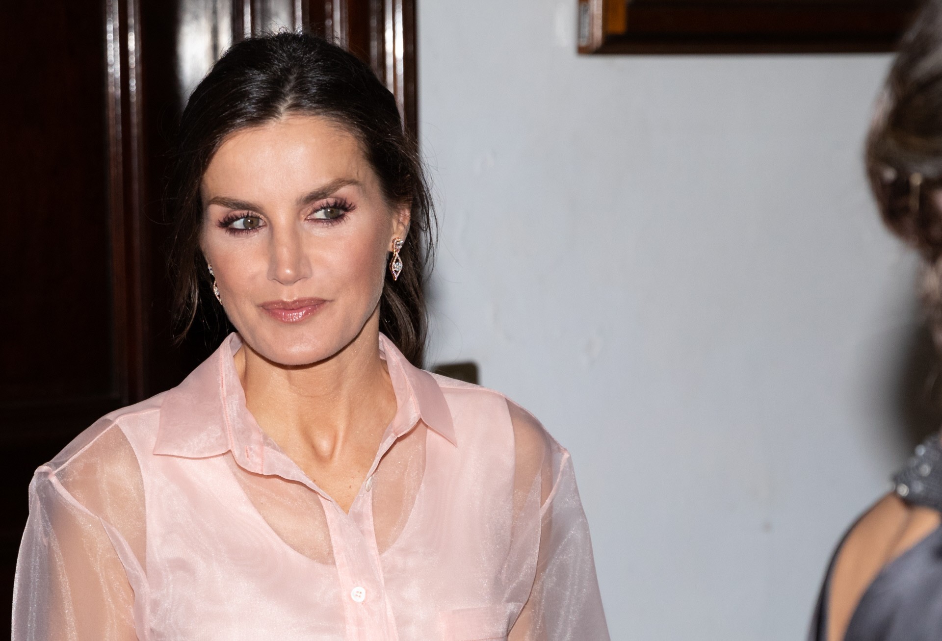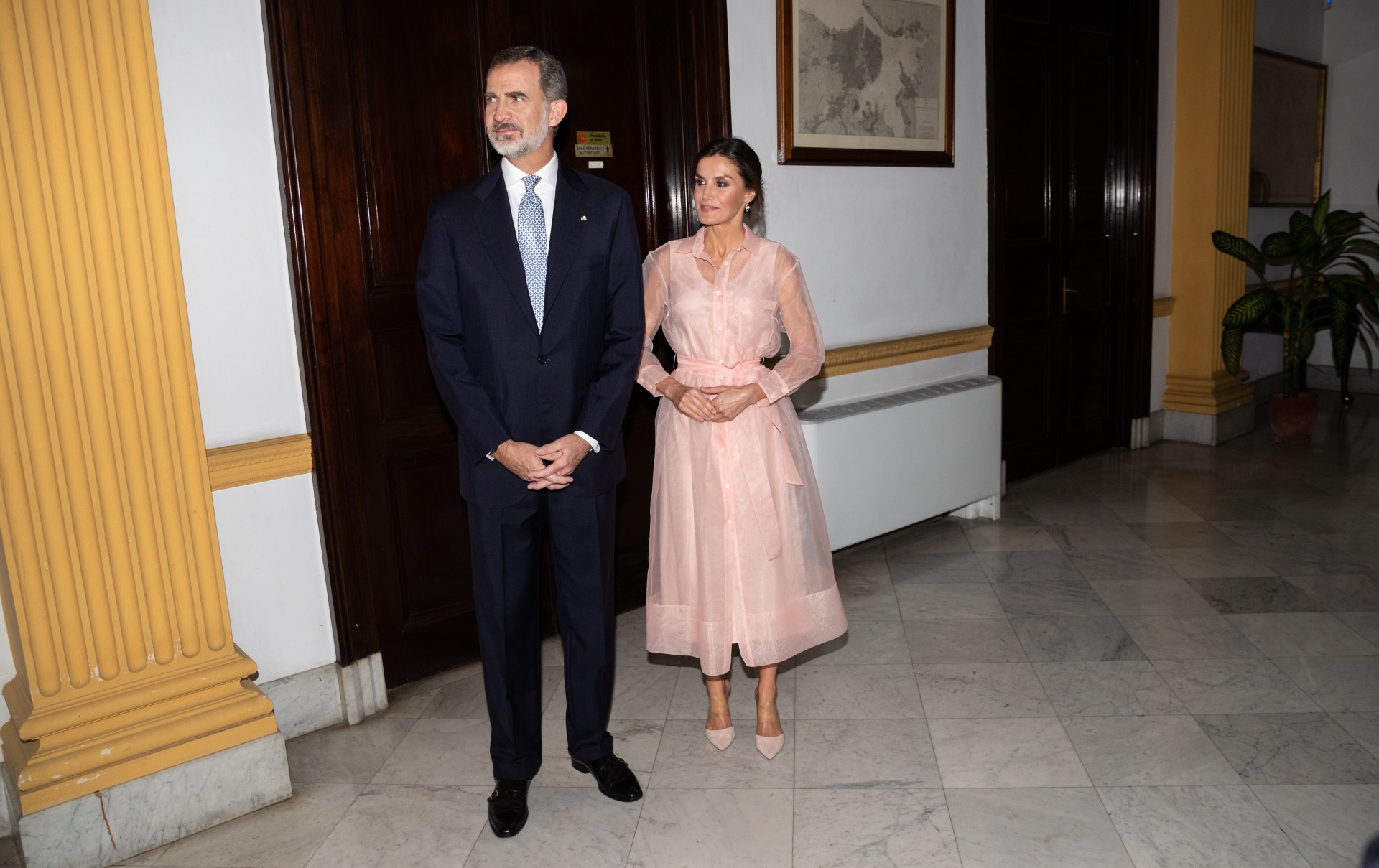 oña Letizia acudió a la Embajada española en Cuba con un diseño de Maje de la primavera-verano 2019. Este vestido rosa empolvado en organza nos recuerda a la aplaudida creación de Felipe Varela para el Día de la Hispanidad.