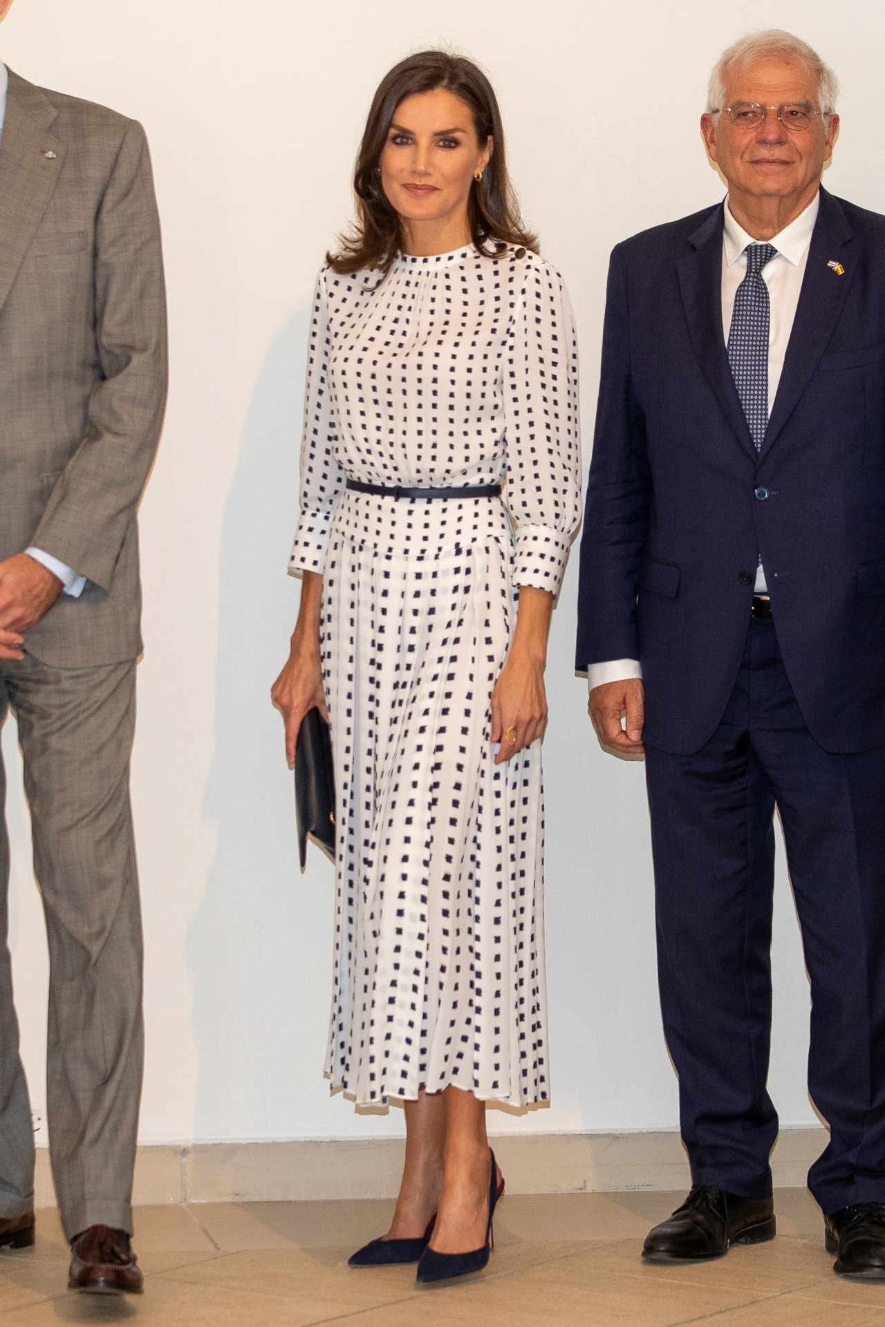 En acto frente al monumento de José Martí, uno de los primeros actos oficiales en La Habana, Letizia volvió a sacar del armario un elegante vestido blanco de lunares de Carolina Herrera, de falda vaporosa pero entallado en la cintura. Cabe señalar la ausencia de grandes joyas para mayor sobriedad.