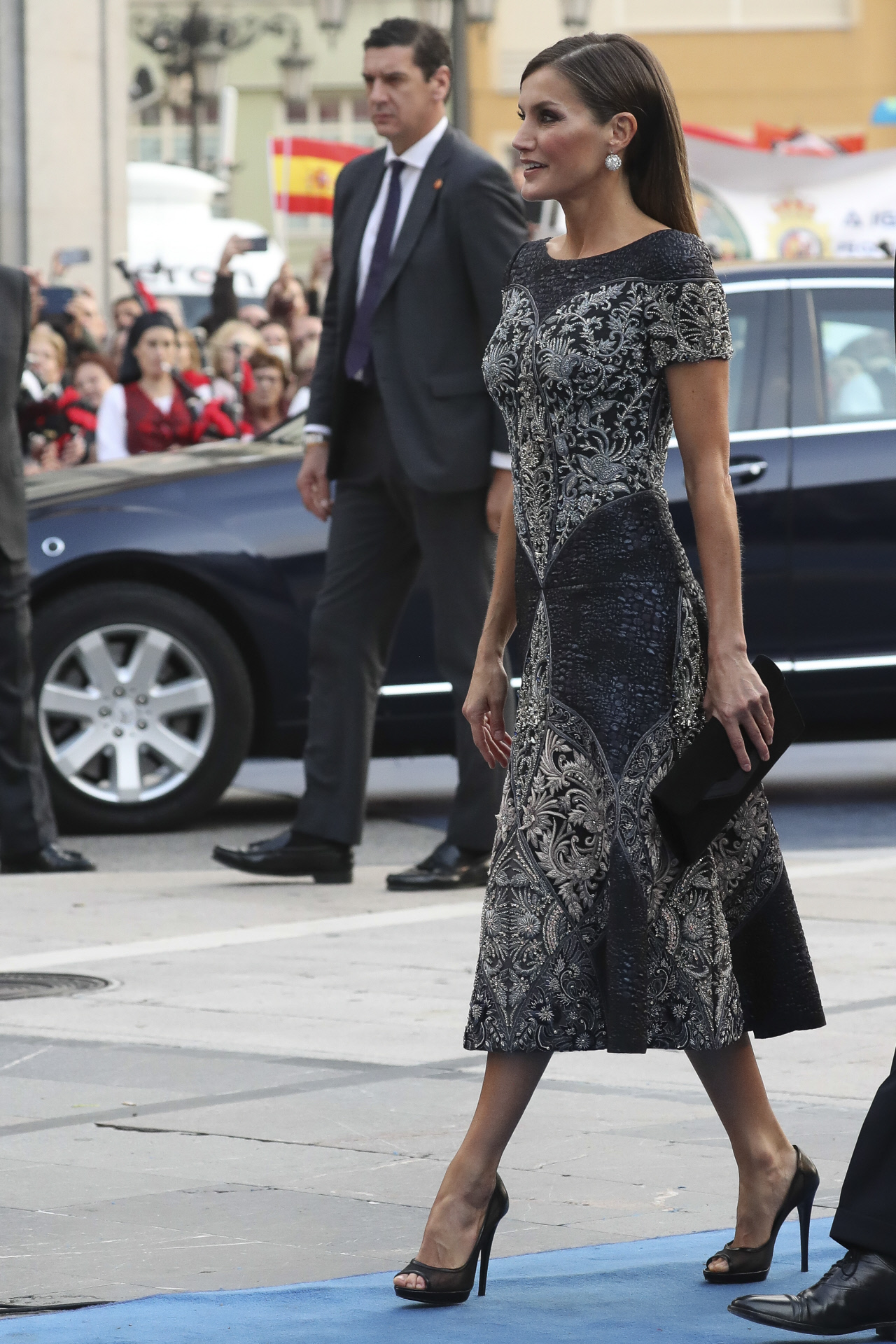 La ceremonia de los premios Princesa de Asturias y los días de antes supusieron otro despliegue fantástico de los estilismos de la Reina. En la recepción previa a los premios la Reina volvió a escoger al fallecido Pertegaz entre sus apuestas. Lo hacía con un vestido gris en línea lápiz con una gran lazada en el cuello, acaparando el protagonismo con unos grandes bordados florales en relieve.