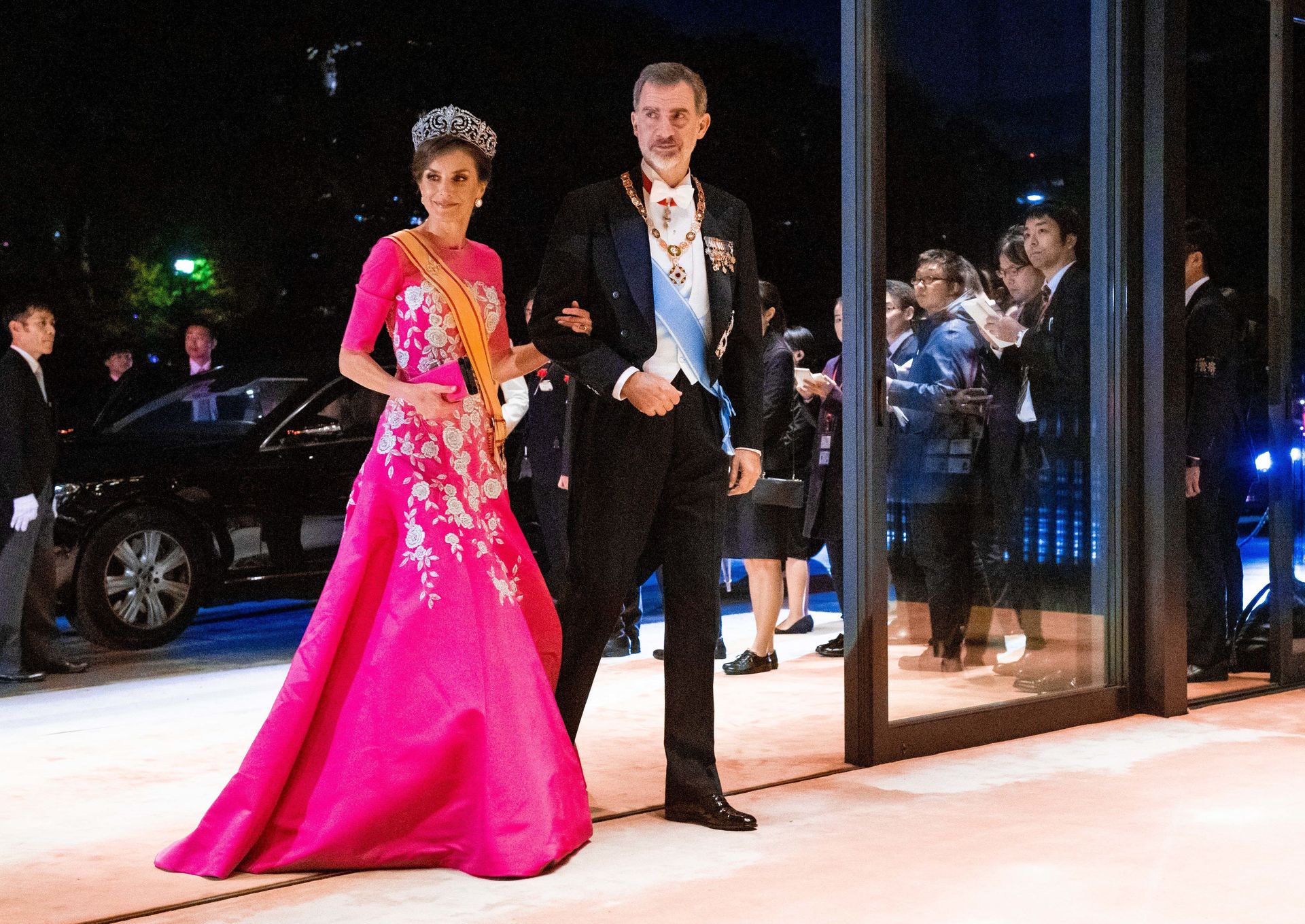 El viaje de los Reyes a Japón con motivo de la entronización del emperador Naruhito nos ha dejado algunos de los estilismos de la Reina Letizia que serán imposible de olvidar. El primero, un diseño de manga larga y largo hasta los pies, con un estampado de flores en tonos rosas sobre un llamativo verde lima firmado por Matilde Cano. Lo ha combinado con un cinturón ancho y diadema de terciopelo. Además, la Reina rescató el collar de chatones que Alfonso XIII le regaló a Victoria Eugenia.