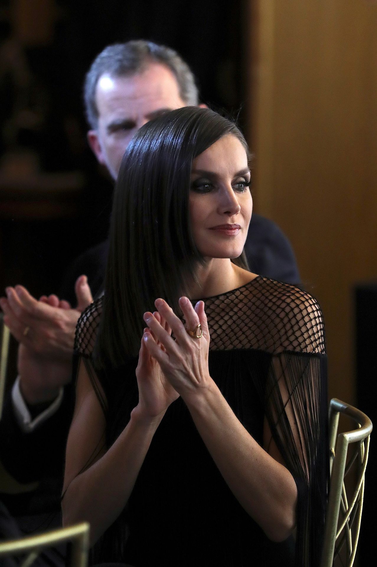 Para la entrega de los premios que suponía el debut de la Princesa Leonor en los premios que llevan su nombre, la Reina volvía a confiar en su color favorito y Felipe Varela: vestido de seda de manga corta por debajo de la rodilla y falda semitransparente con una silueta que realza su figura. Como cinturón escogió un drapeado brillante con cristales incrustados.