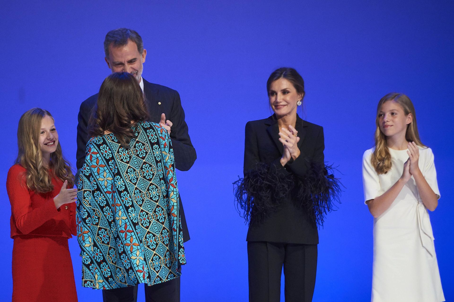 Solo unas semanas después volvía a conquistar a todos los presentes con uno de los looks más elegantes de este año. La Reina acudía a los premios Princesa de Gerona con un esmoquin negro con plumas en las mangas, firmado también por Pertegaz. Lo combinaba con unos zapatos clásicos en negro y pendientes de diamantes.