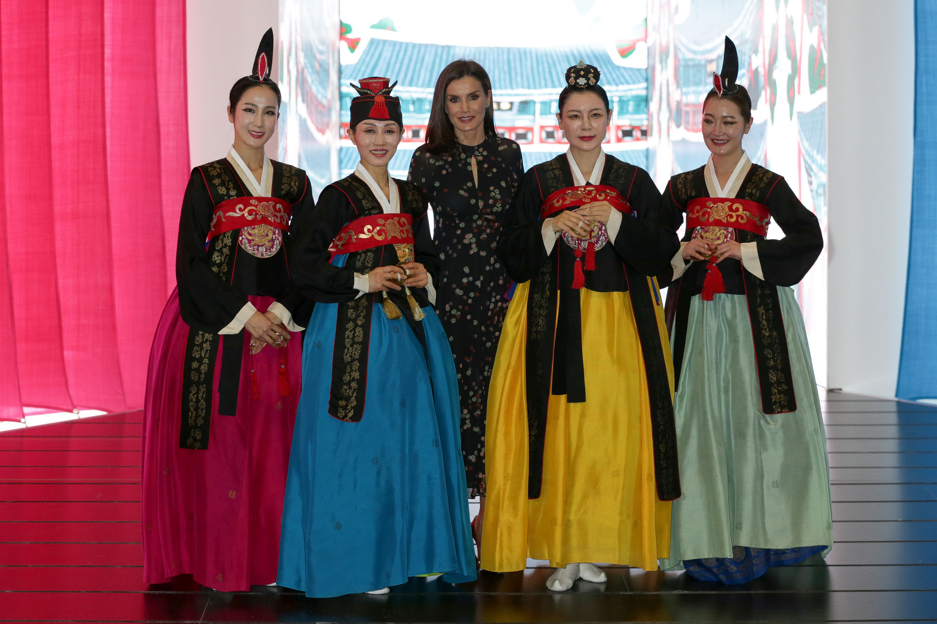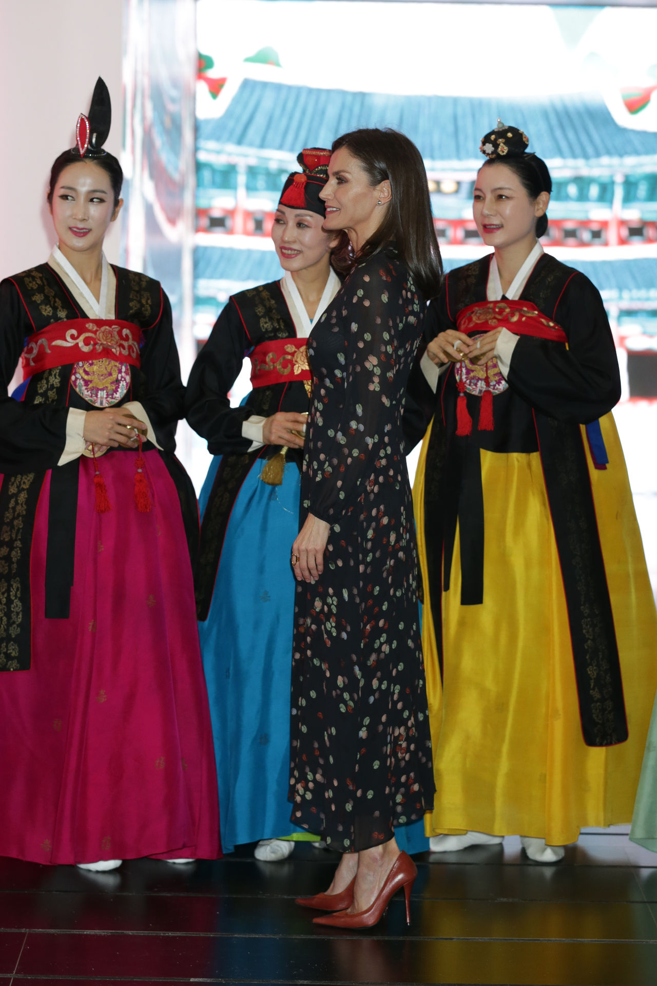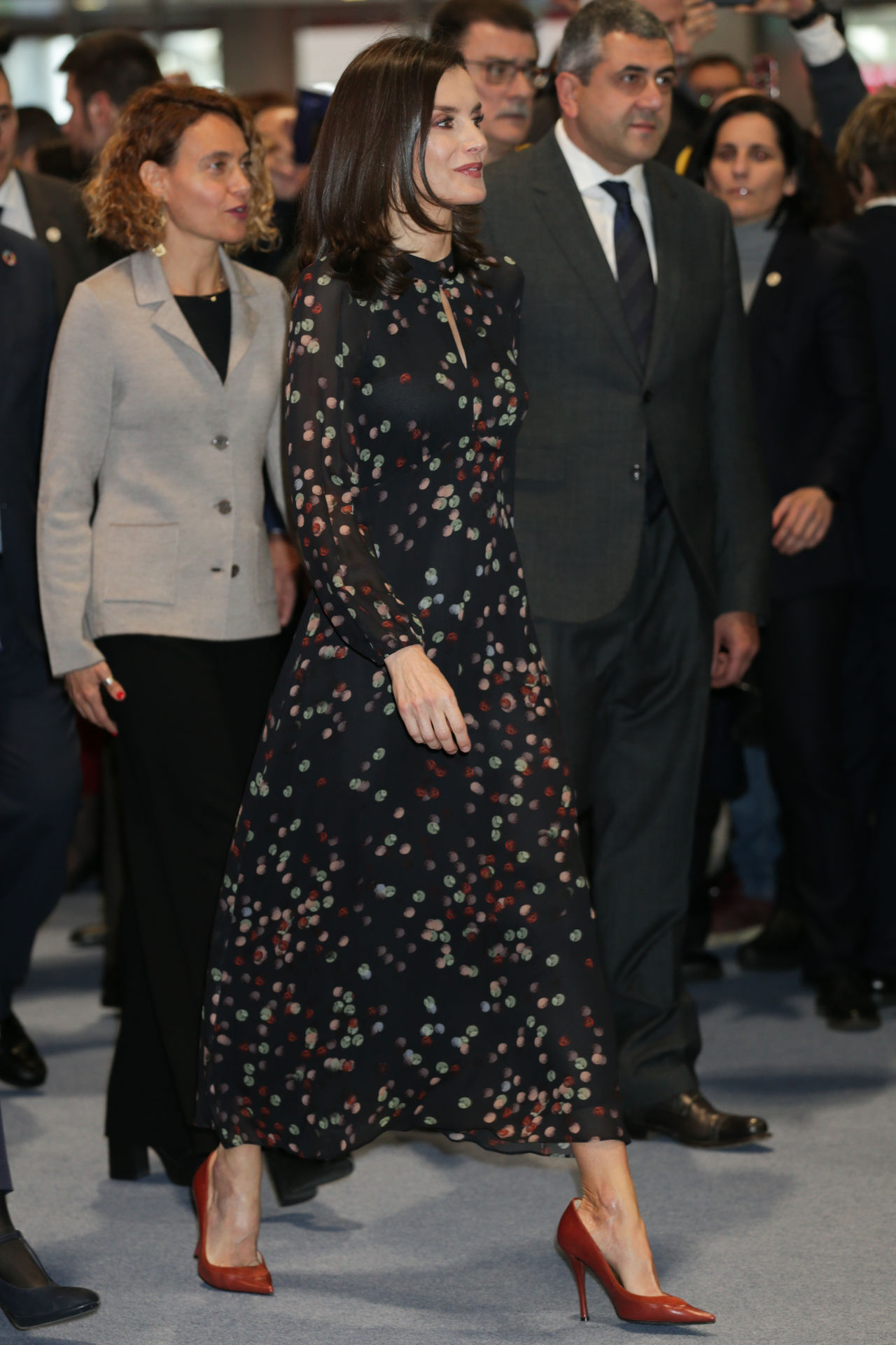Doña Letizia lució un vestido de gasa negra con estampado colorido efecto confeti de la firma española Massimo Dutti, una prenda que estrenó el pasado mes de octubre en Seúl durante su Visita de Estado a Corea tras acudir a la entronización de Naruhito de Japón en Tokio.