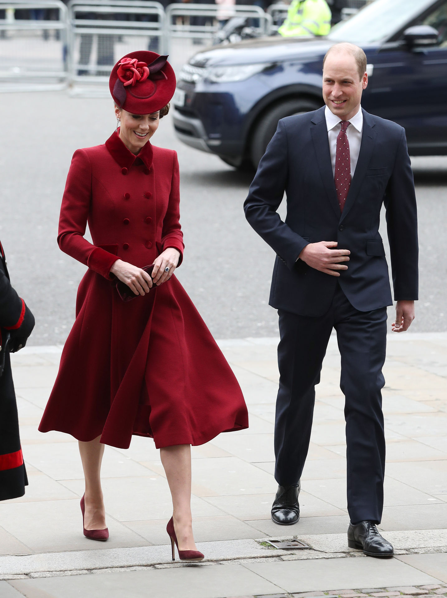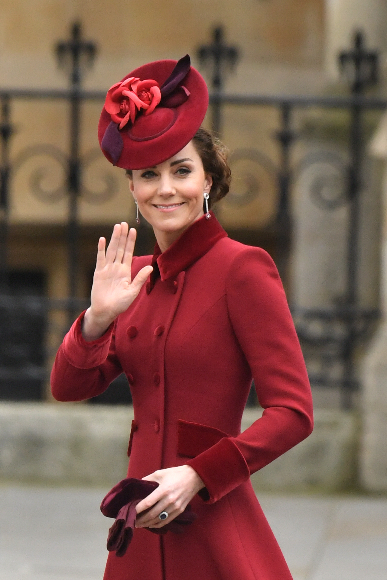 Por su parte, Kate, fiel a su estilo, ha recurrido al rojo para el encuentro con su cuñada. Ha rescatado un abrigo burdeos de corte clásico en terciopelo y con doble botonadura. Un diseño de Catherine Walker.