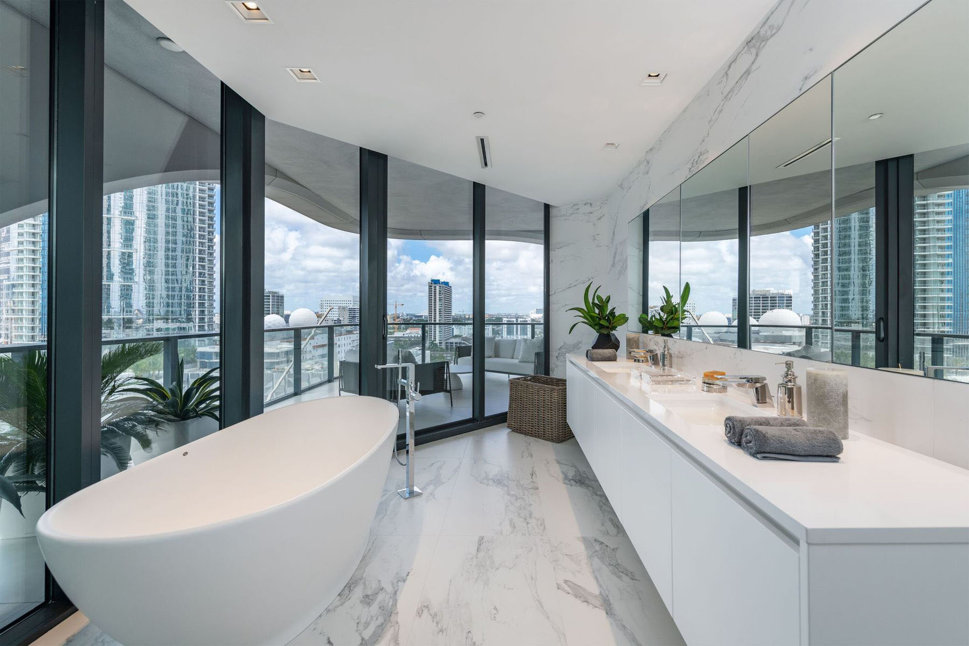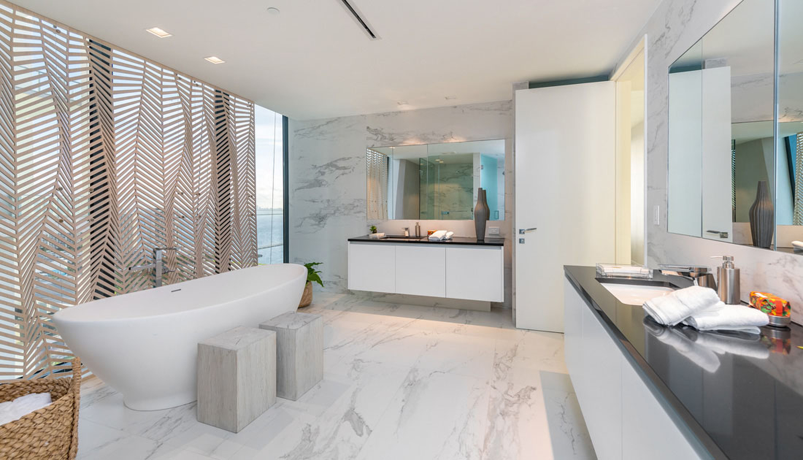 Los baños también cuentan con grandes ventanales. El mármol cubre paredes y suelos, con mobiliario selecto de grandes diseñadores de inspiración europea.