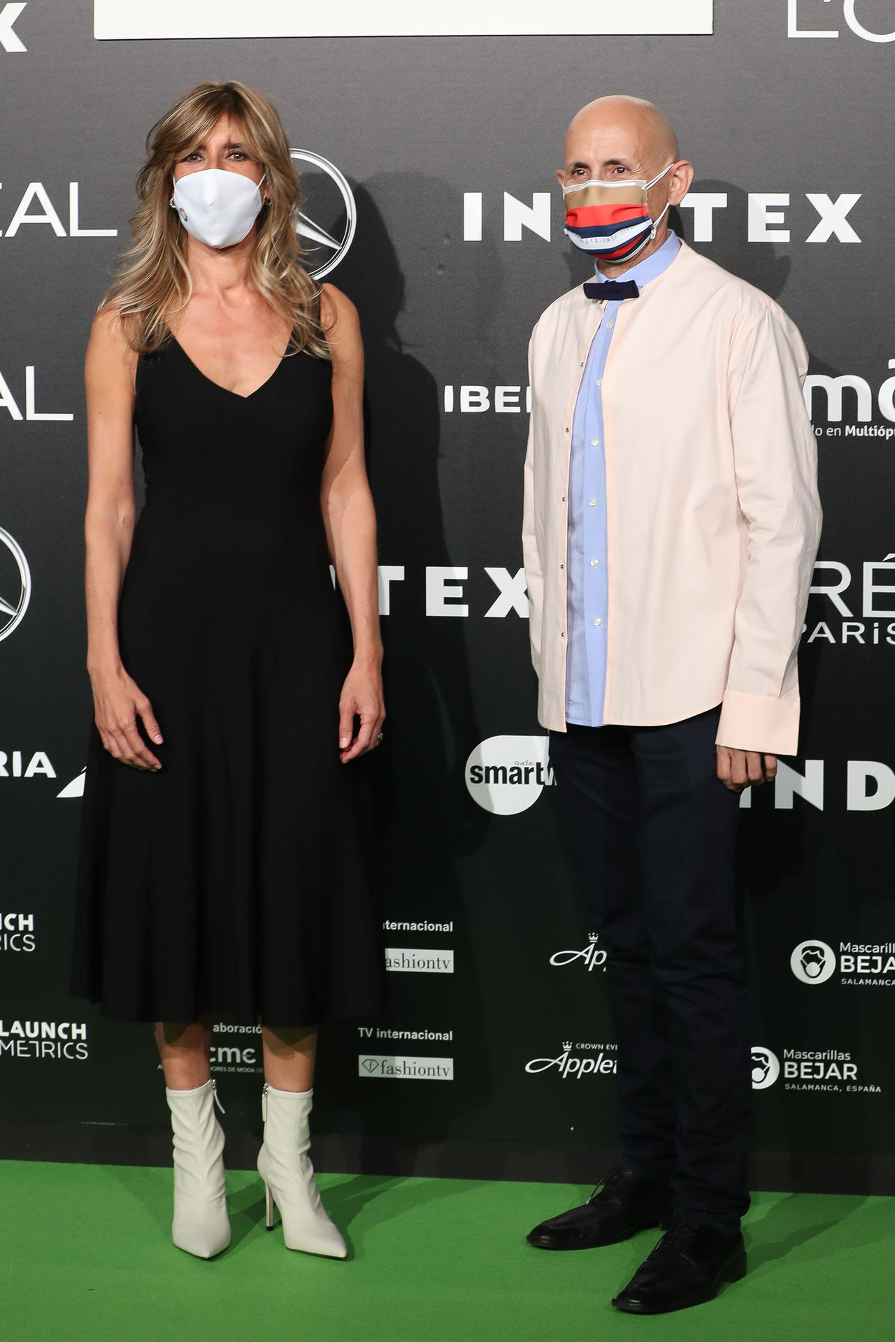 Begoña Gómez, muy comprometida con la moda española, acudió en la jornada del jueves a los desfiles de Andrés Sardá y Deova&Lomba. La mujer de Pedro Sánchez posó con el diseñador Modesto Lomba en el photocall y lo hizo con un sencillo vestido negro al que dio un toque diferente combinándolo con botines de piel blancos.