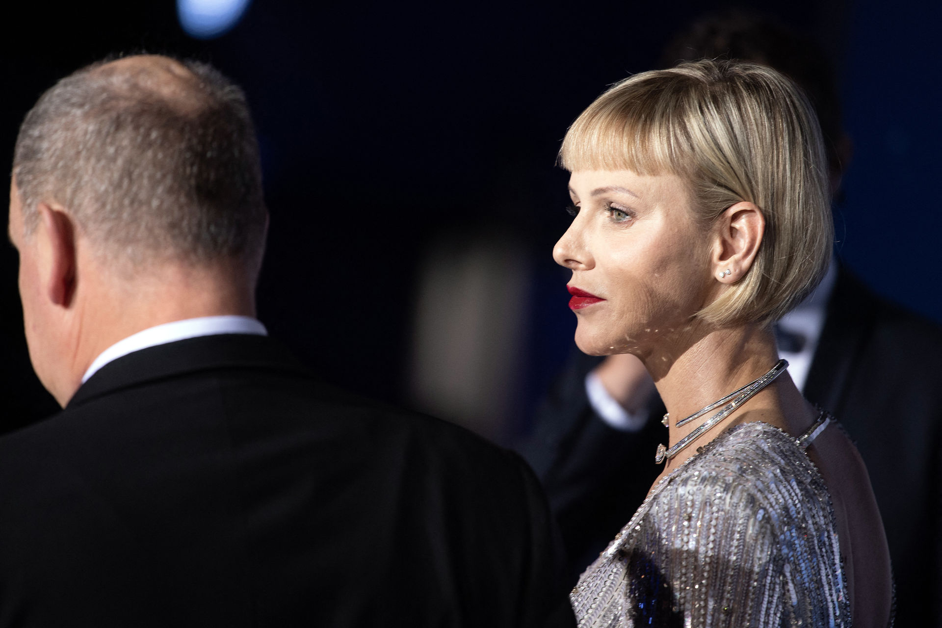 Para recibir a los invitados, Charléne de Mónaco optó por un elegante vestido plateado de lentejuelas, con escote pico y manga larga, firmado por Jenny Packham, un estilismo que aderezó con una vistosa gargatilla mientras que el príncipe Alberto se decantó por un esmoquin negro. En cuanto al maquillaje, Charlène, que volvió a lucir un flequillo muy corto, optó por colorear los labios en rojos y marcar la mirada con notas plateadas y doradas