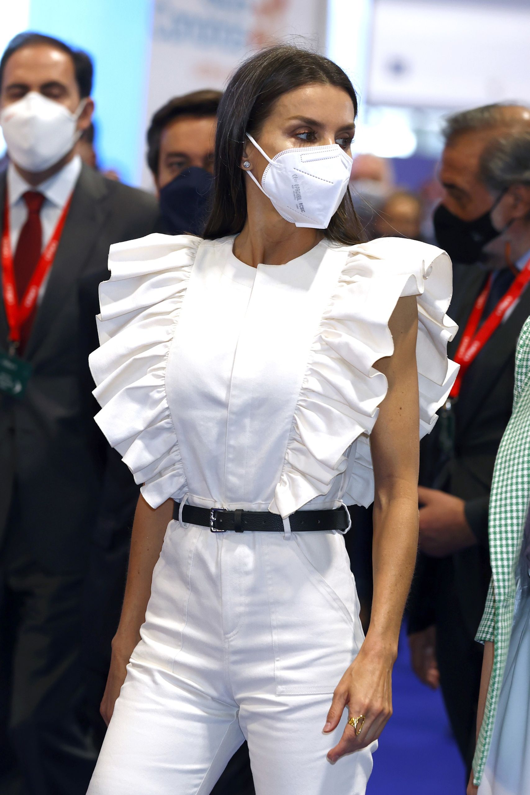 En sus últimas apariciones la Reina ha apostado por tirar de fondo de armario, pero esta ocasión estrenó un original mono blanco con el que demuestra su apoyo a la moda española.