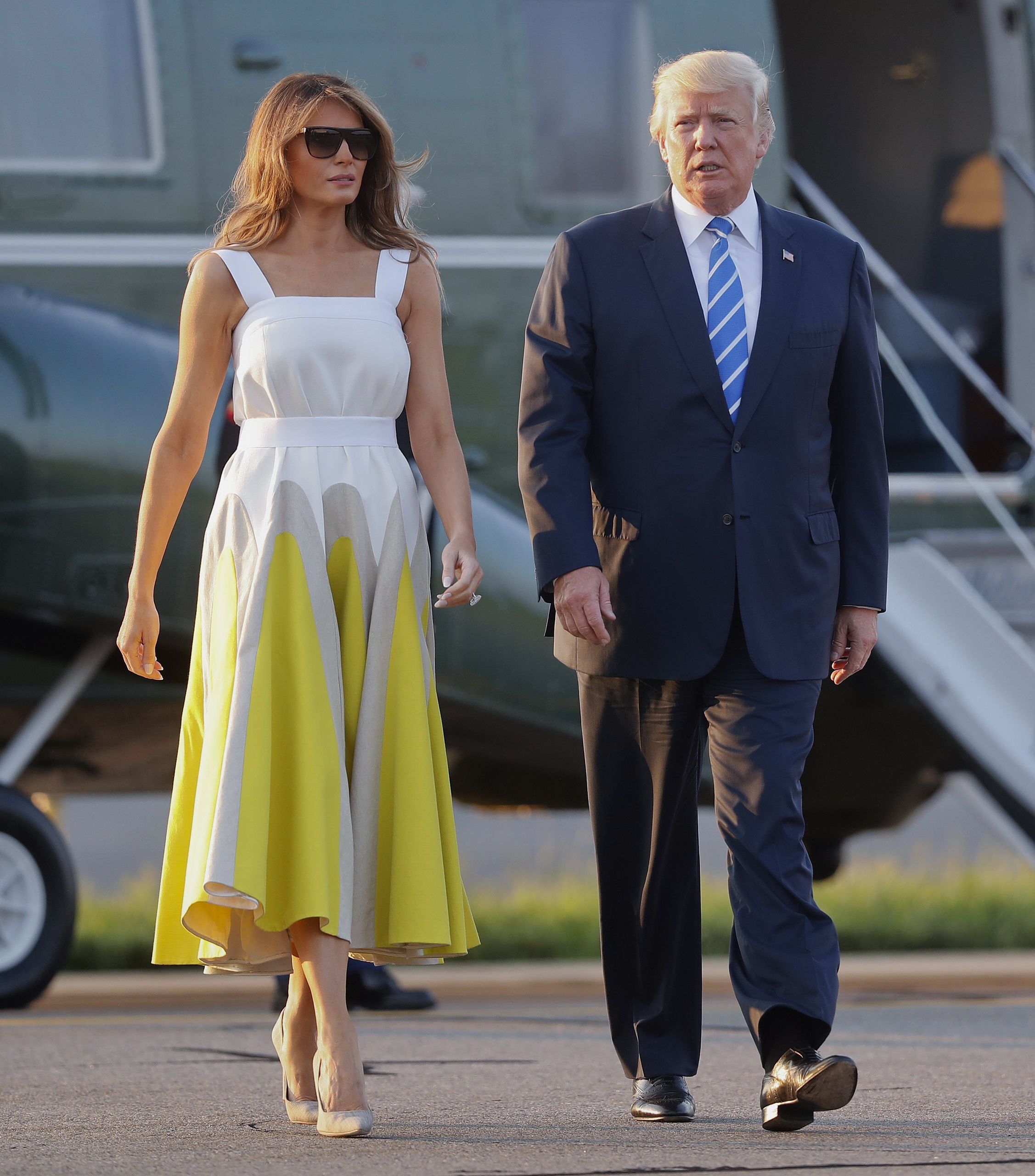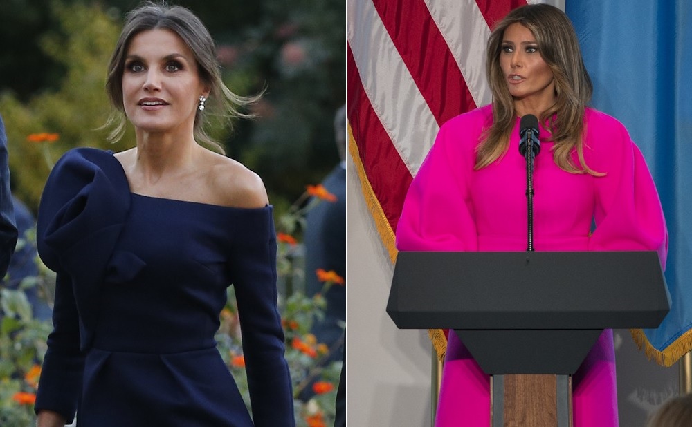 En el viaje oficial de Pedro Sánchez a Estados Unidos en 2018, su mujer Begoña Gómez escogió la firma favorita de Melania el año anterior, aunque con algo menos de acierto. Para asistir a la recepción del presidente Donald Trump con motivo de la 73 Asamblea General de la ONU, Begoña lució un vestido con corte asimétrico en el bajo, hombros descubiertos y colores azul marino (muy parecido a la bandera que tiene al lado), azul claro y granate.