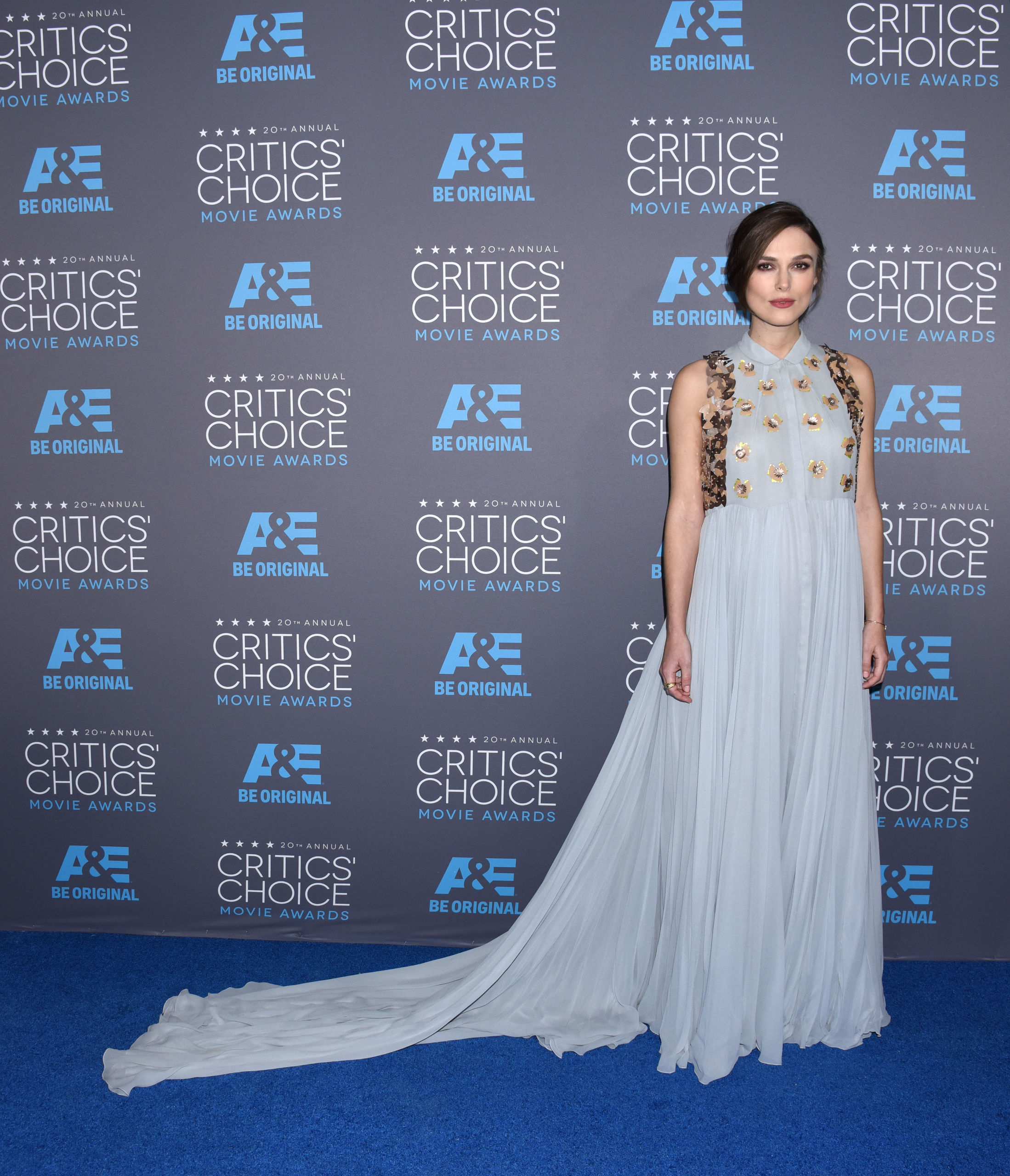 Antes de Melania, muchas actrices lucieron Delpozo en Estados Unidos. En 2015, Keira Knightley escogió este vestido en seda y gasa pastel, con detalles joya bordados en el pecho, para asistir a los Critics Choice Awards de ese año.