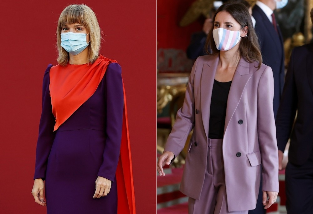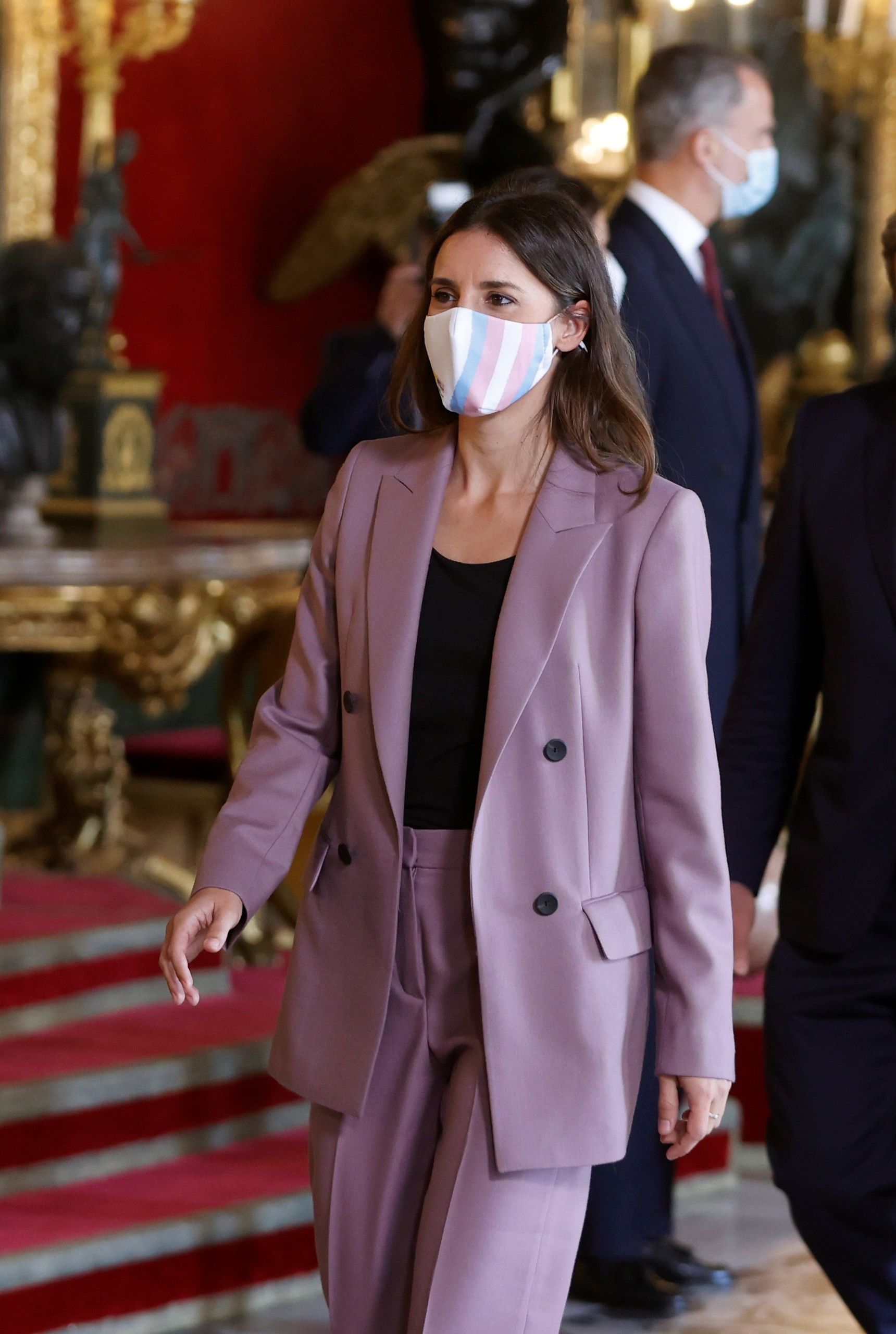 Irene Montero, con traje de chaqueta lila y siempre reivindicativa, utilizó una mascarilla con la bandera trans.