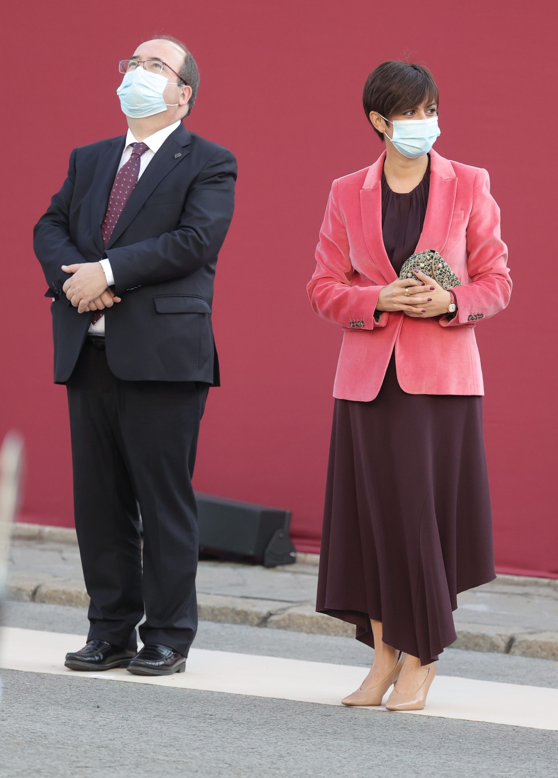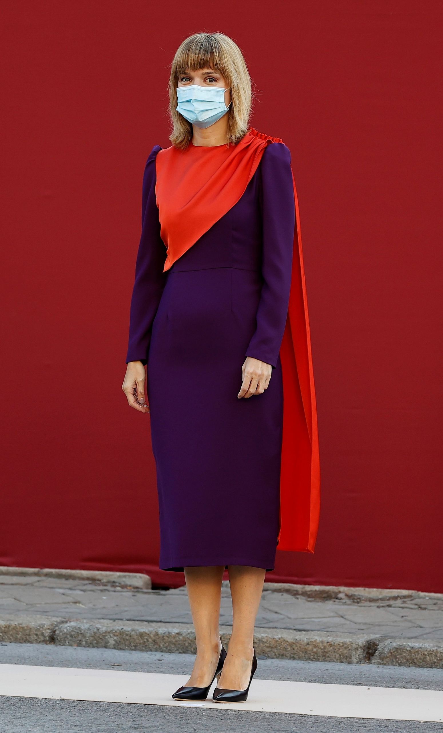 Pilar Alegría, ministra de Educación y Formación Profesional de España, con un vestido morado a media pierna al que decidió sumar una capa roja.