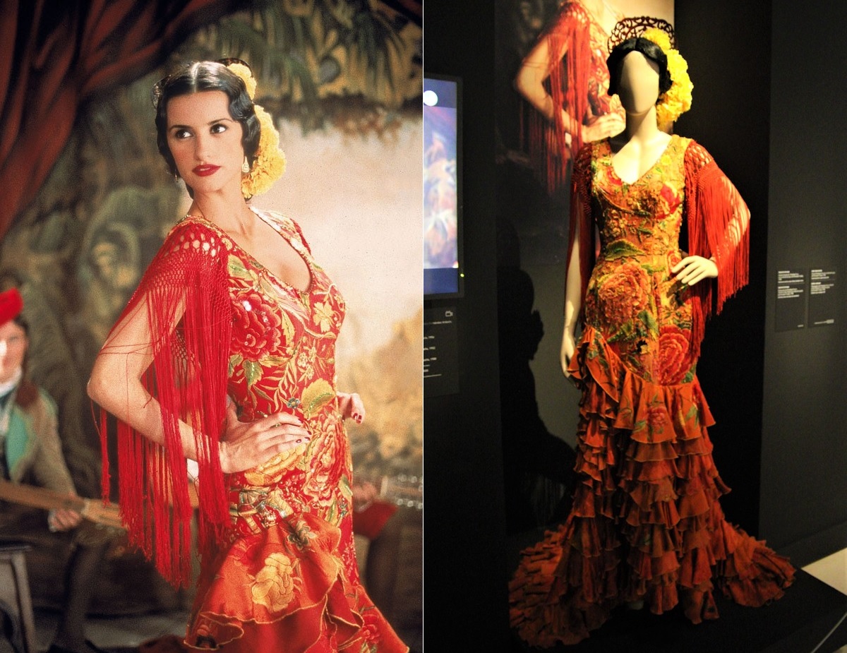 Vestido llevado por Penélope Cruz en La niña de tus ojos (1998), de Fernando Trueba, durante una de las escenas más memorables. La actriz, que interpreta a Macarena, canta en playback Los piconeros mientras luce con gracia un “colín”: un vestido similar a una bata de cola pero más pequeño. Confeccionado con un mantón de Manila en seda, despliega llamativos adornos bordados y teñidos a mano. Se trata de una creación de la reconocida Sastrería Cornejo, con una amplia trayectoria de trabajo en el cine. La cinta de Trueba recibió el Goya al mejor diseño de vestuario, que corrió a cargo de Lala Huete y Sonia Grande.