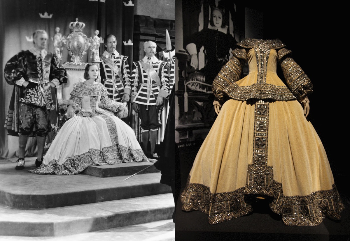 Gilbert Adrian, conocido solo como Adrian, se encargó del vestuario de la película La reina Cristina de Suecia (1933), de Rouben Mamoulian. Este es uno de los espectaculares trajes que lució Greta Garbo, en terciopelo de algodón, y acompañado por un collar de perlas. La ejecución del vestido, que recuerda a una armadura, fue una pesadilla por su desorbitado precio y sus casi 30 kg de peso. A Garbo le daba dolor de cabeza y hacía demasiado ruido con cada movimiento, por lo que el diálogo se volvía imposible. Como anécdota, la reina Cristina recibió educación masculina en el siglo XVII y pagó con el trono su rechazo al matrimonio y la maternidad. El estudio rechazó que se presentara al personaje como bisexual, pero la actriz y el diseñador colaboraron para que fuera evidente para el espectador.