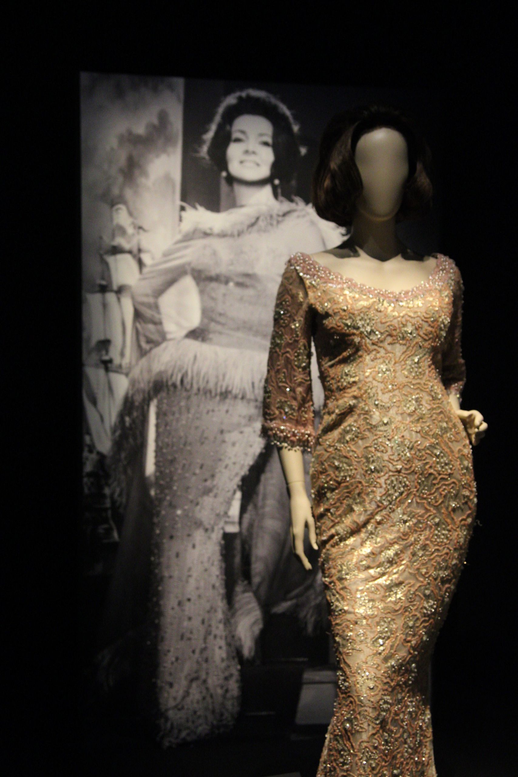 Vestido similar al que lució Sara Montiel en La dama de Beirut (1965), de Ladislao Vajda. Se trata de un diseño que formó parte del armario personal de la actriz, tejido en seda salvaje, bordado de lentejuelas de plata sobredorada, perlas, lúrex dorado y crin de caballo.