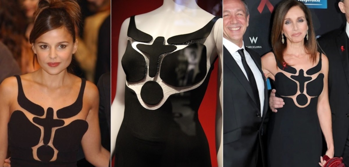 La moda española puede presumir de vestir a un buen número de estrellas nacionales y cada vez más internacionales. El vestido España de Sybilla es una de las creaciones más icónicas de la diseñadora neoyorkina afincada en España, que tres años después de recibir el Premio Nacional de Diseño de Moda 2015, tuvo que echar el cierre por no poder hacer frente a las deudas. Se trata de un vestido de fiesta en crespón de seda en color negro. Largo, entallado al cuerpo con escote redondo en el delantero y espalda. En el pecho, hilos de nylon unen las distintas piezas geométricas que forman el delantero, partiendo de una cruz latina. El forro es de la misma tela que el vestido, lo que le proporciona una caída perfecta. Elena Anaya lo lució en 2003 y Ana Belén en 2011.