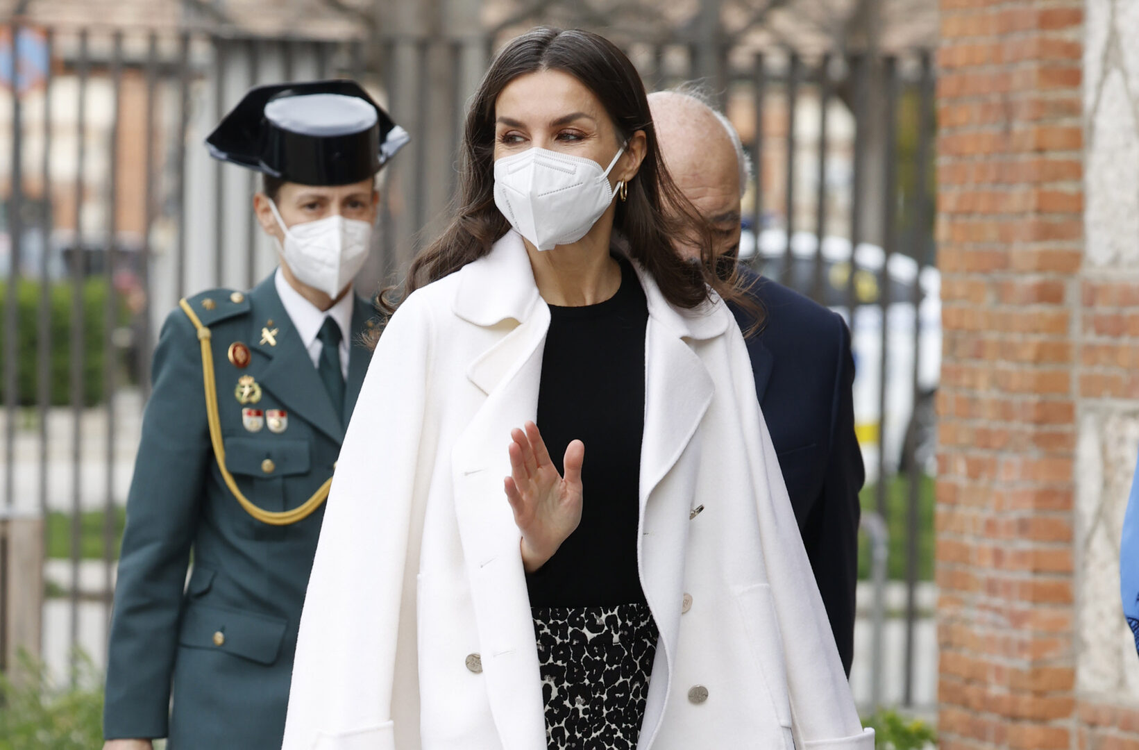 Apostando de nuevo por la combinación 'black & white' por la que se ha decantado en numerosas ocasiones en los últimos tiepos, la Reina ha lucido un estilismo sofisticado y rompedor en el que, además de lucir una de las faldas más 'atrevidas' y versátiles de su vestidor, ha recuperado el abrigo que comparte con la princesa Leonor.