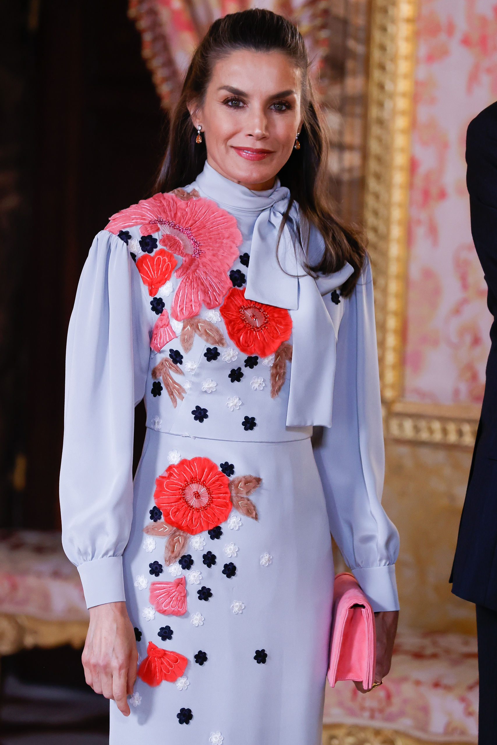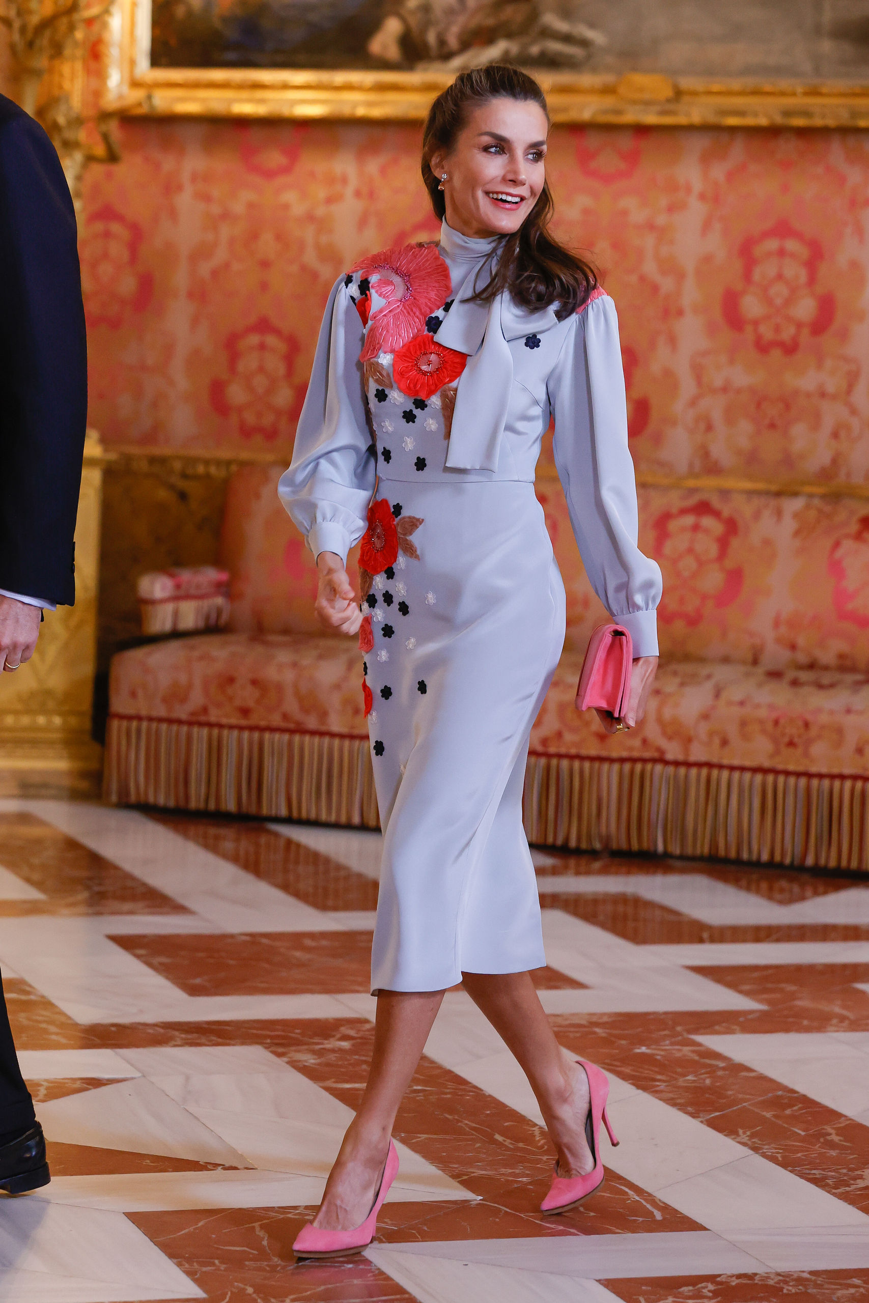 Dejando a un lado el maquillaje, la Reina derrochó elegancia con un vestido reciclado de su armario. Doña Letizia vuelve a recurrir a este bonito y colorido diseño de Pertegaz que lució por primera vez en los Premios Princesa de Asturias de 2019.