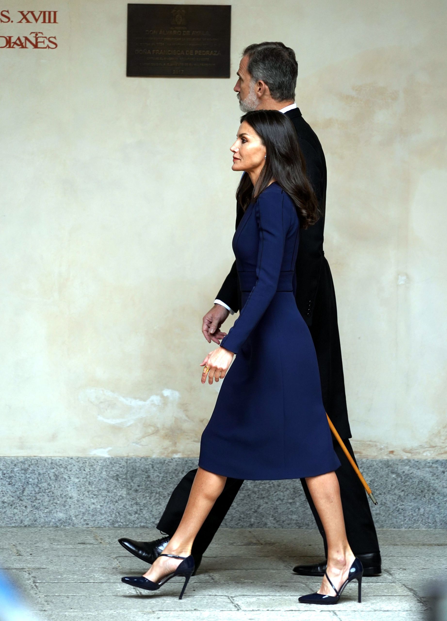 Como es habitual, doña Letizia recurrió a los tacones altos. En esta ocasión, unos de Magrit con tiras en azul marino y de charol.