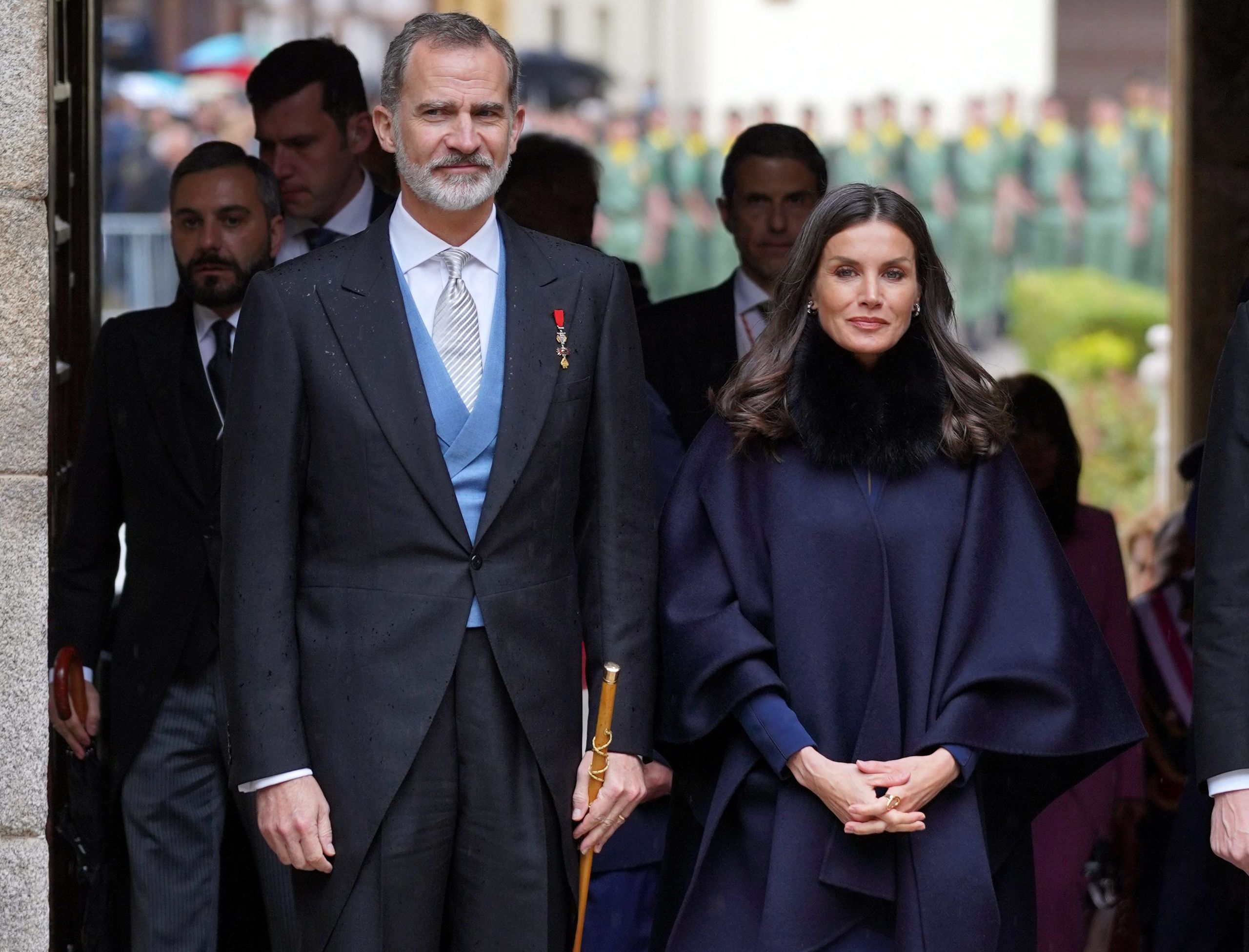 Para resguardarse del imprevisible frío y las lluvias, la Reina vistió una capa azul también de Carolina Herrera con pelo sintético en el cuello.