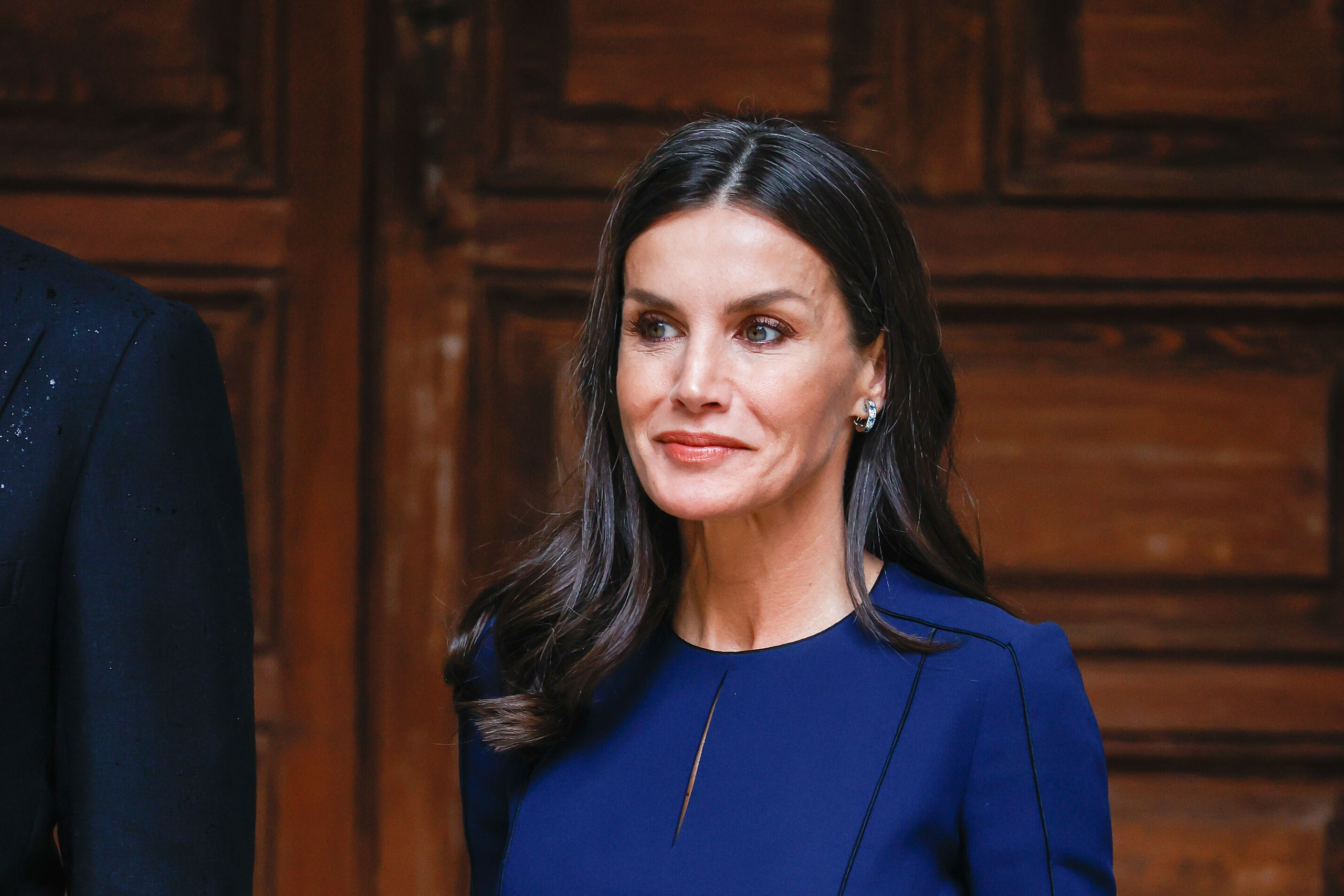 Tras lucir un vestido primaveral con flores en relieve en el habitual almuerzo que los Reyes ofrecen en el Palacio Real la jornada anterior, la reina Letizia apostó este viernes por un look sobrio.