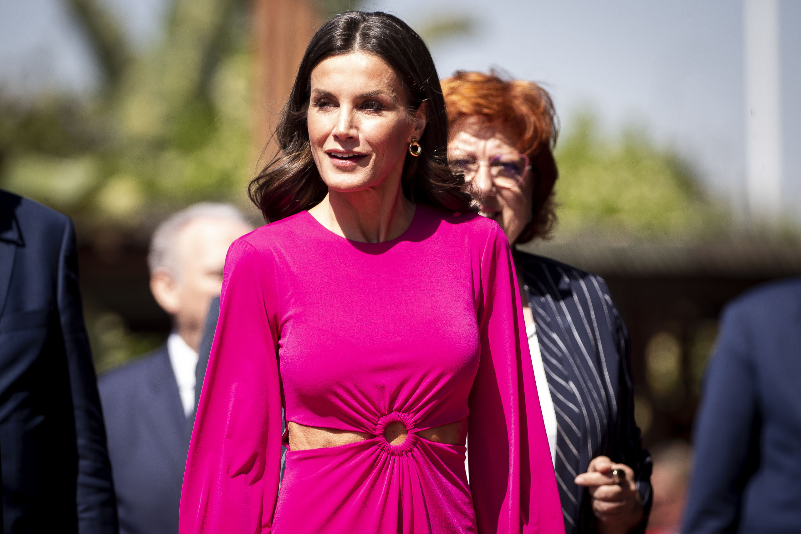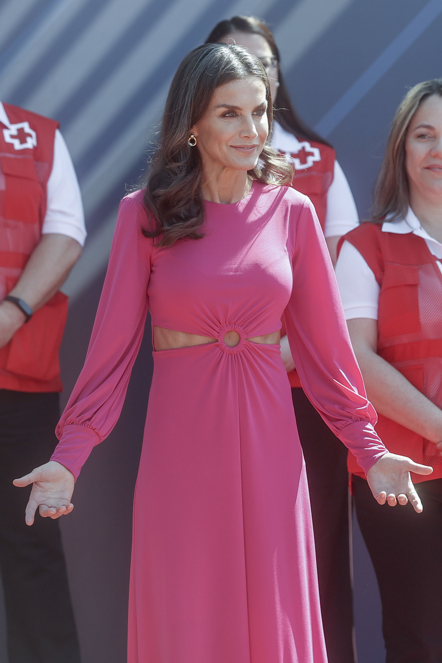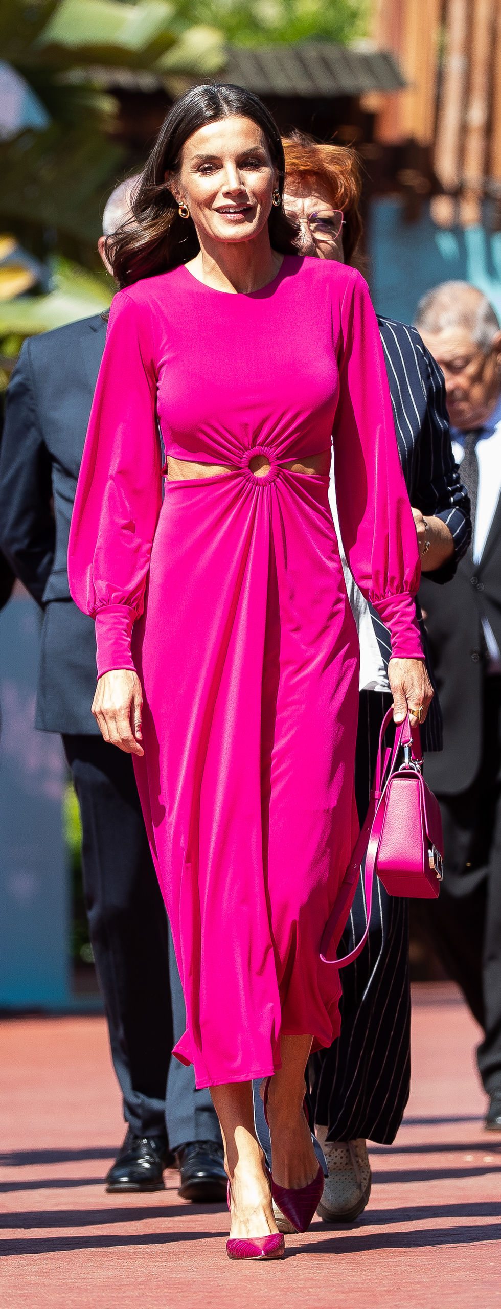Para esta ocasión, la Reina eligió un vestido que seguro no dejará indiferente a nadie. Se trata de un diseño de la marca valenciana Cayro Woman en color fucsia con aro y aberturas en la zona del abdomen, lo que dejó a la vista los fuertes músculos de doña Letizia.