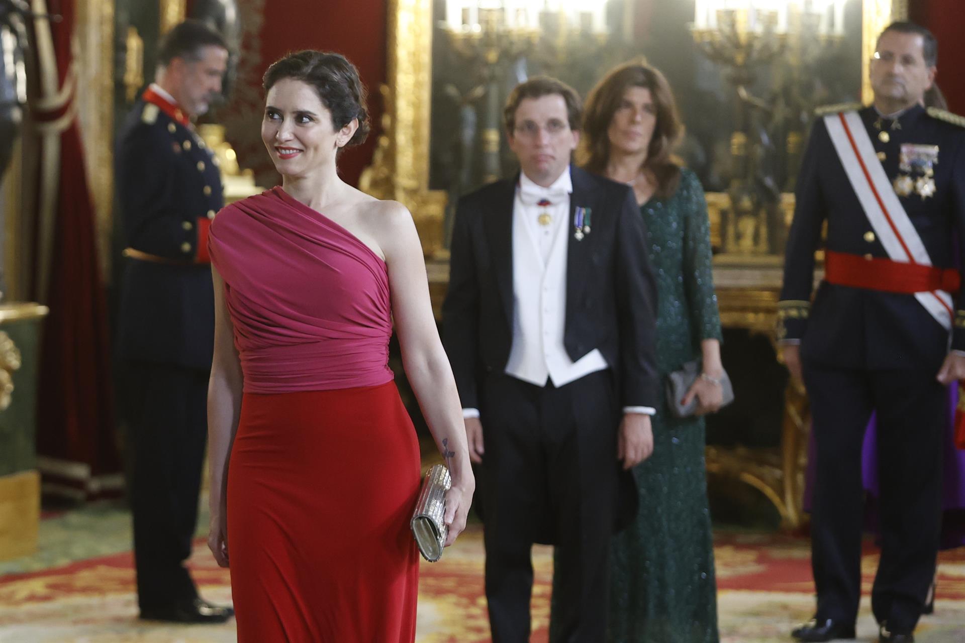 Ayuso decidió recurrir a un diseño de lo más sensual obra de Vicky Martín Berrocal. Un ajustadísimo vestido rojo con el hombro al aire y muy pegado al cuerpo con el que se diferenció, y a la vez compitió, con el elegante atuendo de Letizia en una noche tan destacada.
