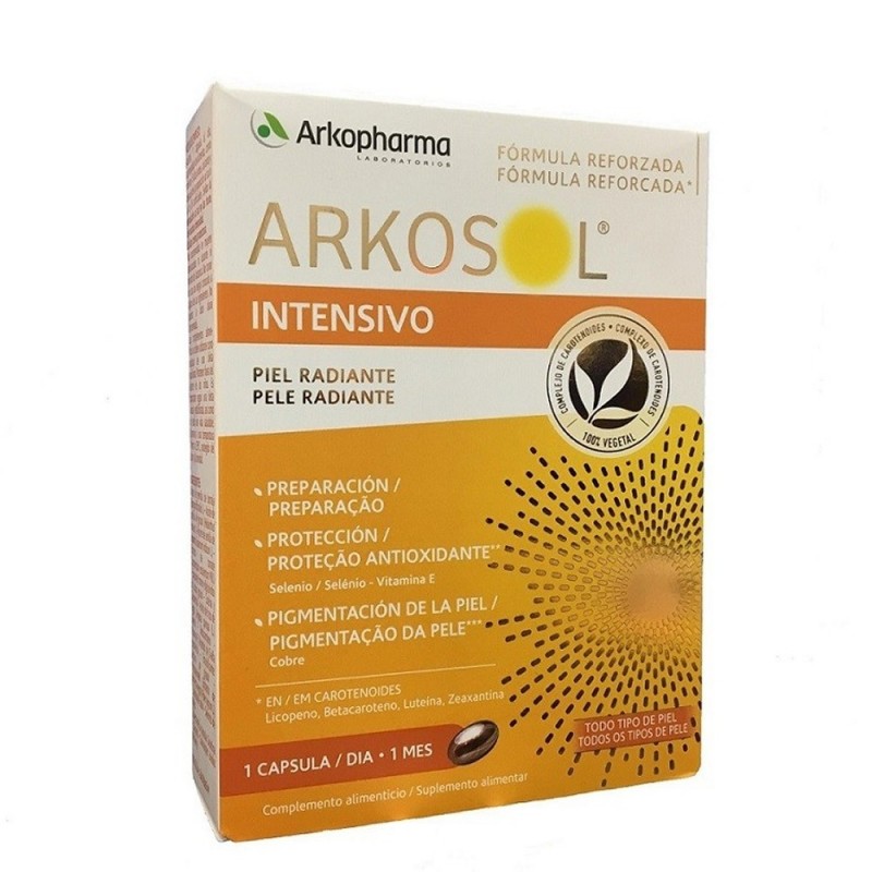 Arkosol Intensivo, de Arkopharma, es un complemento alimenticio a base de carotenoides 100% de origen vegetal y con vitaminas y minerales. Gracias al selenio y la vitamina E, ayuda a la protección de las células frente al daño oxidativo, mientras que el cobre contribuye a la pigmentación normal de la piel.