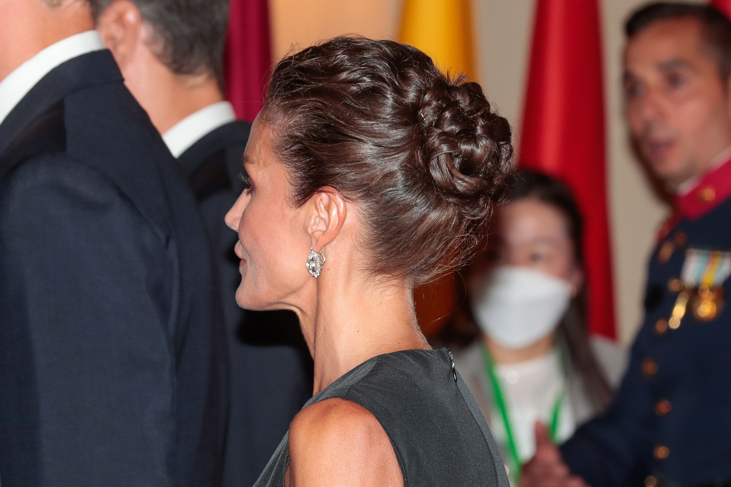 Detalle del recogido de la reina Letizia, un moño trenzado con el que dejó a la vista los grandes pendientes.