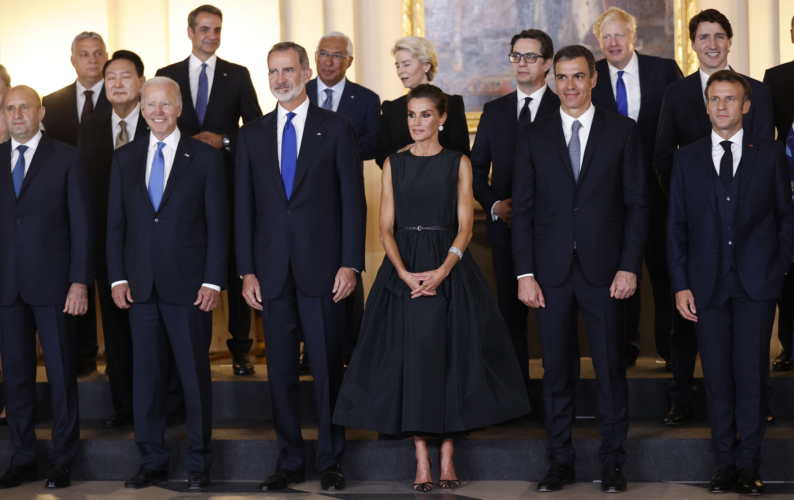 Los reyes Felipe y Letizia posan para una foto de familia junto al presidente de Estados Unidos, John Biden, el presidente del Gobierno, Pedro Sánchez, y el presidente de Francia, Emmanuel Macron, entre otros.
