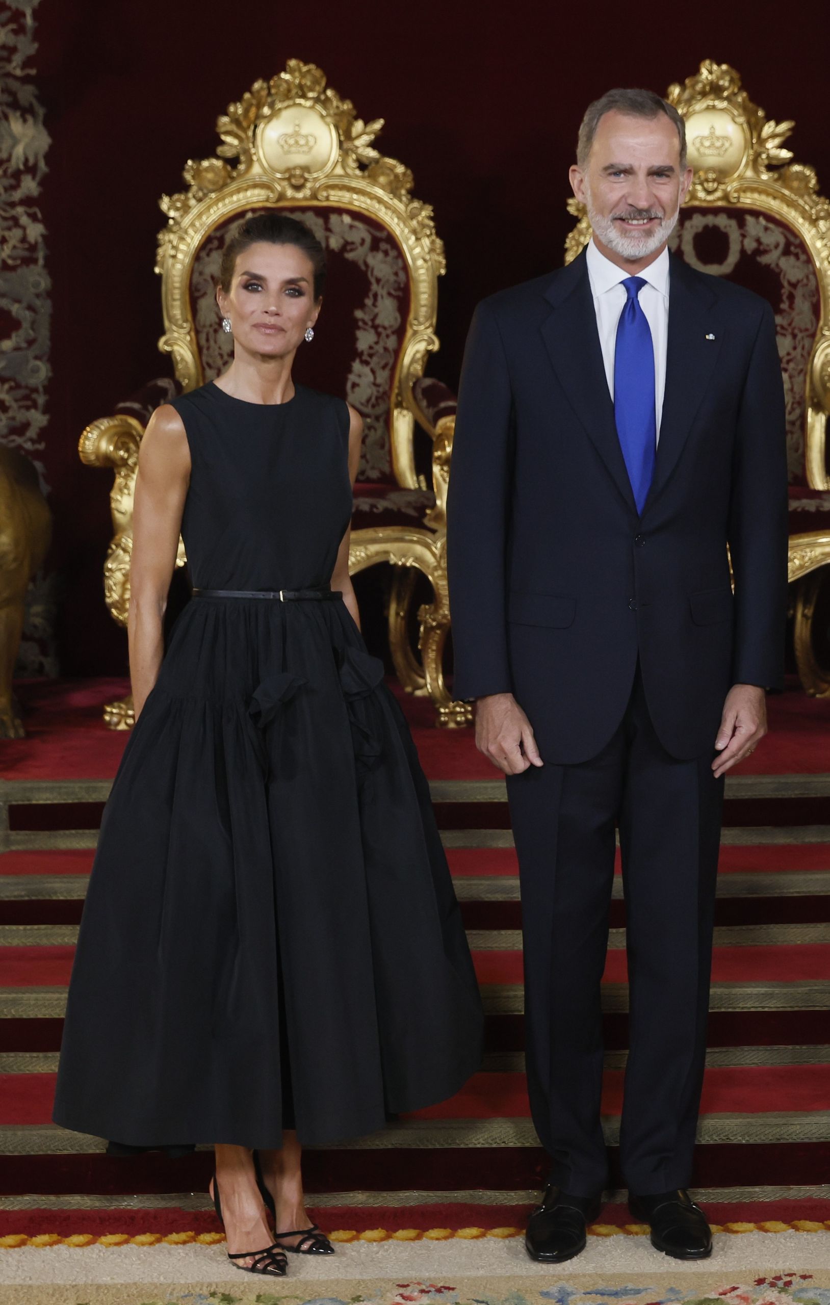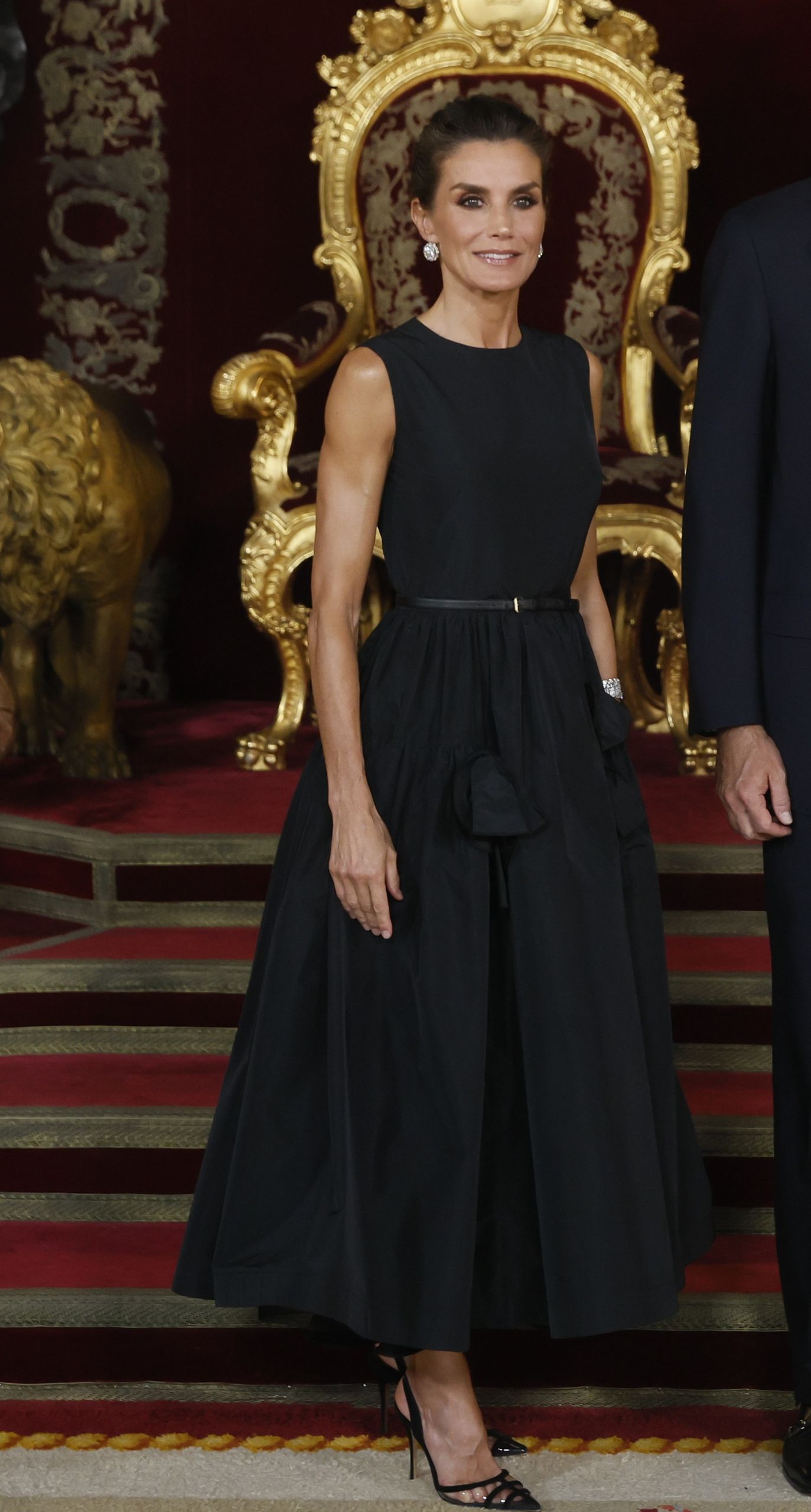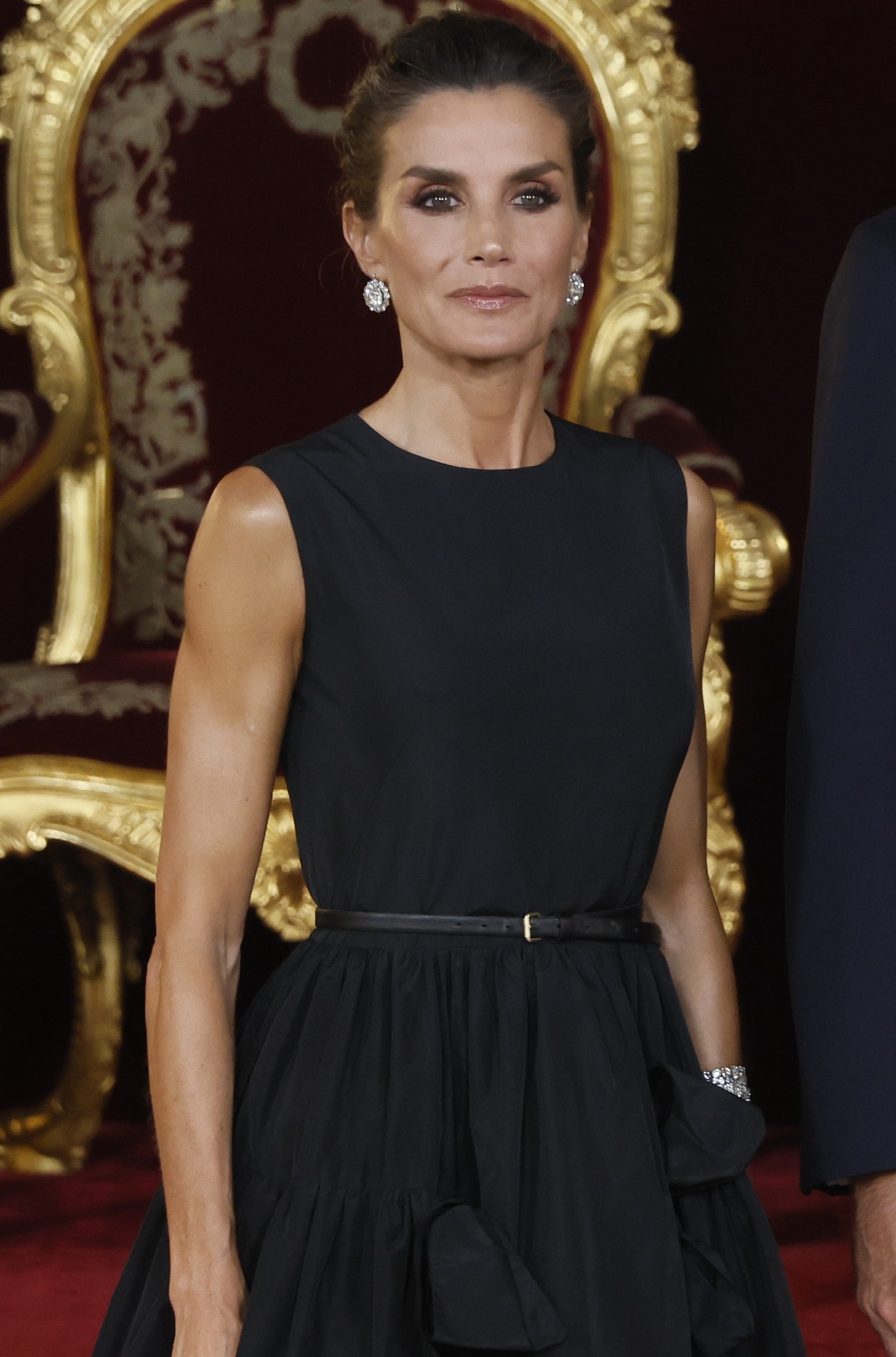 En cuanto a las joyas, doña Letizia lució dos pulseras gemelas de Cartier que pertenecen al joyero real y grandes pendientes de chatones que quedaban a la vista gracias al recogido.