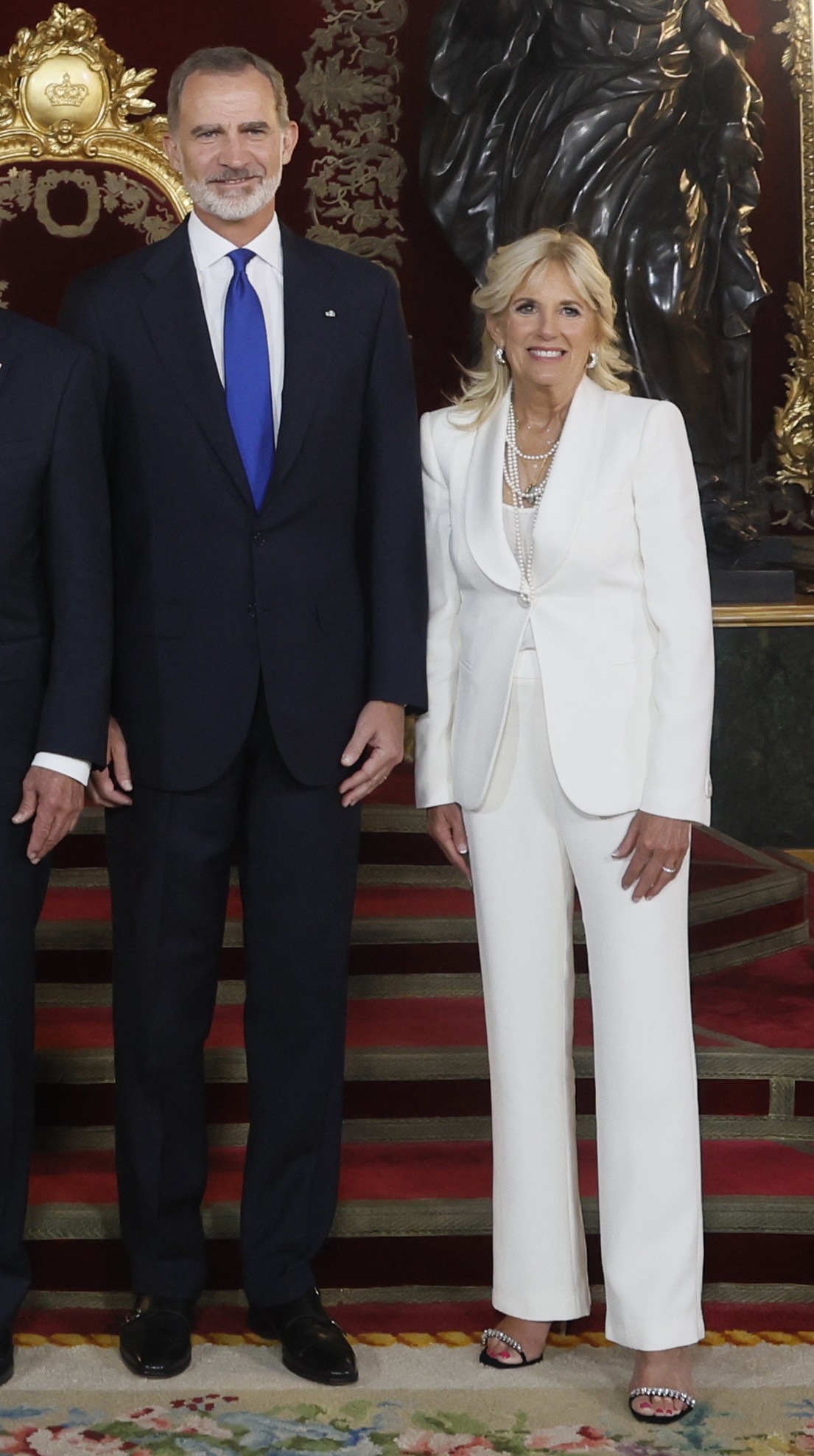 Jill Biden, primera dama de Estados Unidos, acudió con un impecable traje de chaqueta blanco, sandalias de tacón y gran collar de perlas.