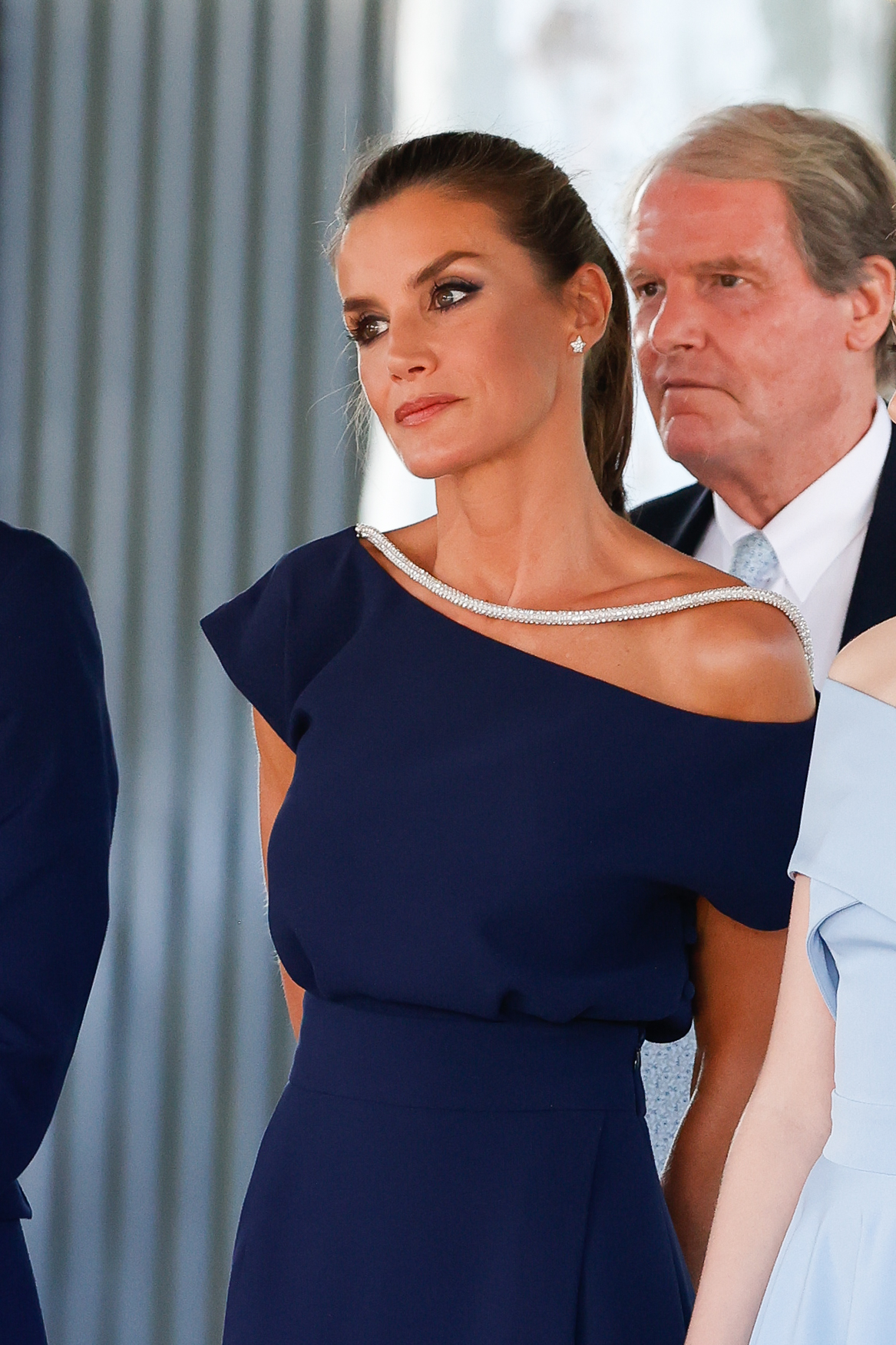 La reina Letizia, que ha optado por un perfil bajo durante la visita de la Familia Real a Cataluña, volvió a dar una lección de estilo con un elegante vestido azul marino. Se trata de un diseño firmado por la marca Boüret para lucir hombros, de cintura ajustada y falda de cruce que estiliza la silueta. Está realizado completamente en crepe.