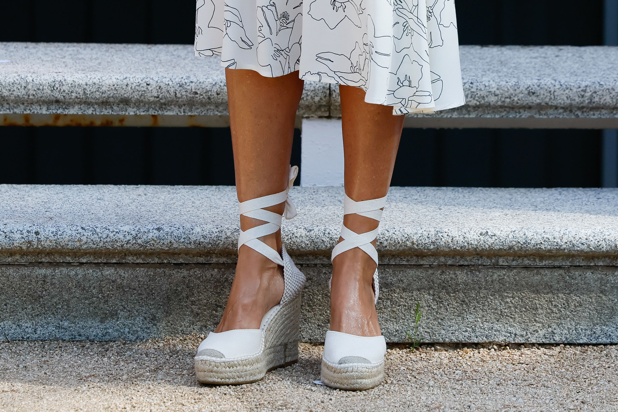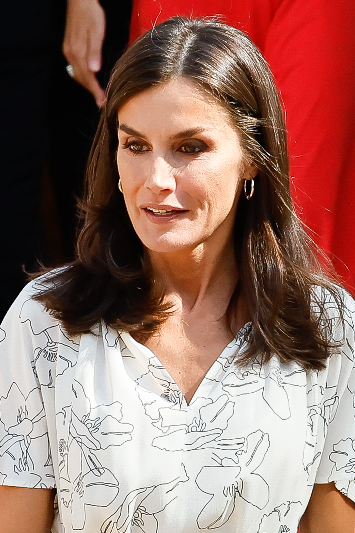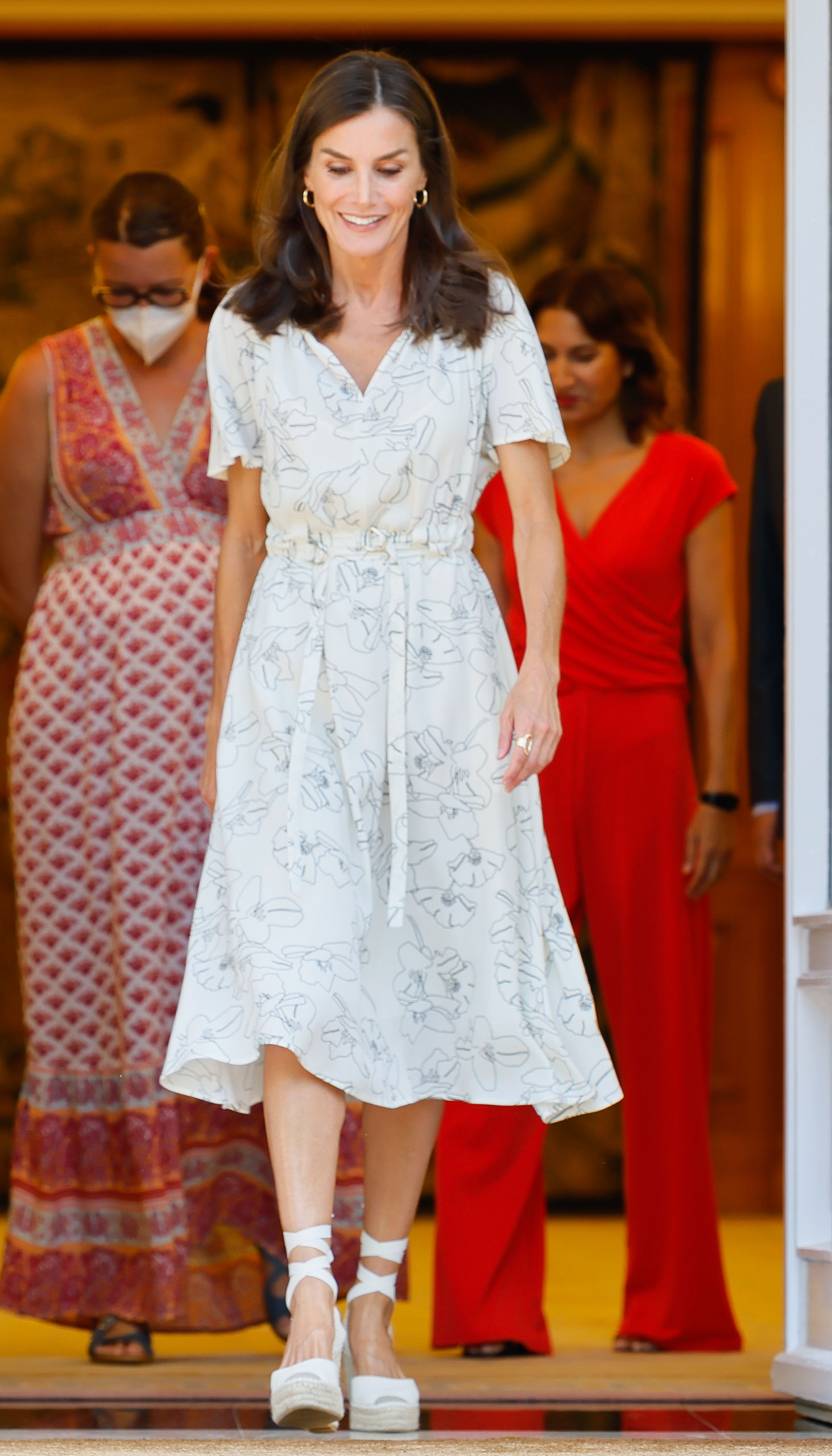 Ideal para la ocasión por sus mangas cortas, su color blanco roto y estampado de flores, la mujer del Rey Felipe VI ha podido remarcar su figura debido a su doble cinturón en la cintura y su corte midi. Para el calzado ha optado por unas alpargatas blancas.