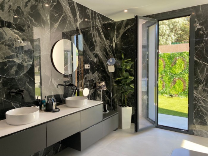 El baño principal, con detalles en mármol negro y salida al jardín.