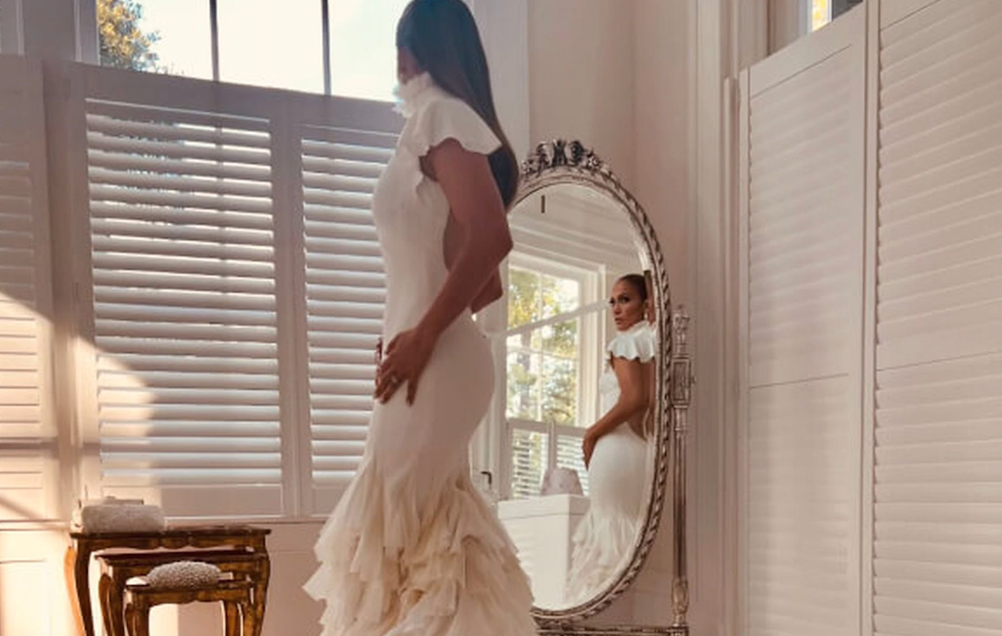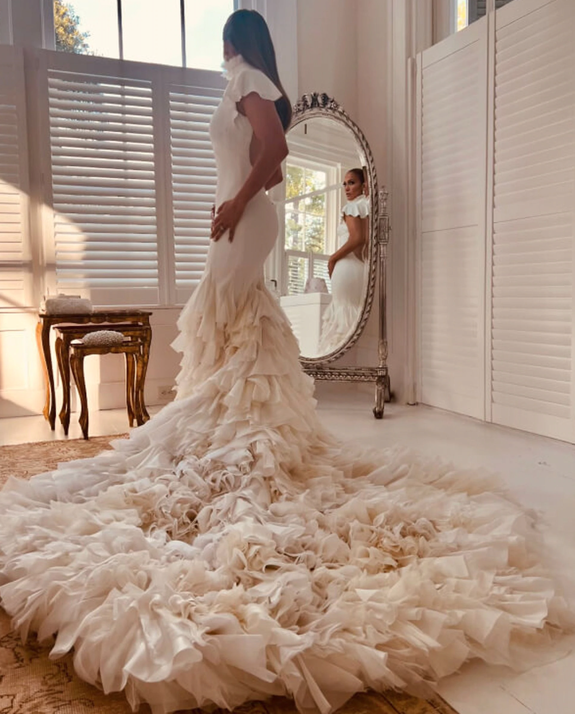 Jennifer Lopez ha utilizado su perfil de Instagram para compartir imágenes de su vestido: una creación de Ralph Lauren modelo sirena, con falda de volantes y gran escote en la espalda. El vestido es de cuello alto, con velo y plumas, así como un despliegue de joyas que incluye unos pendientes de perlas y diamantes.